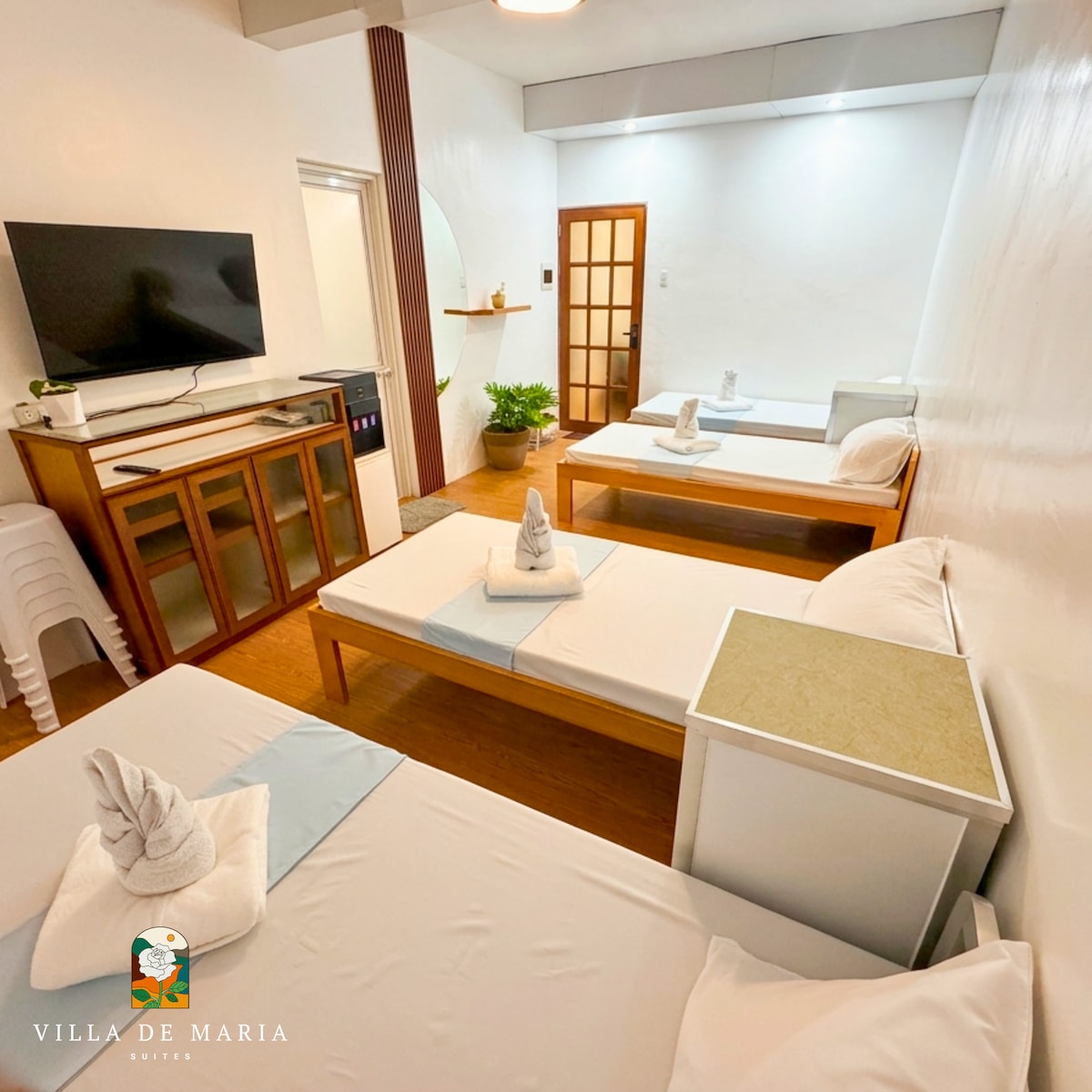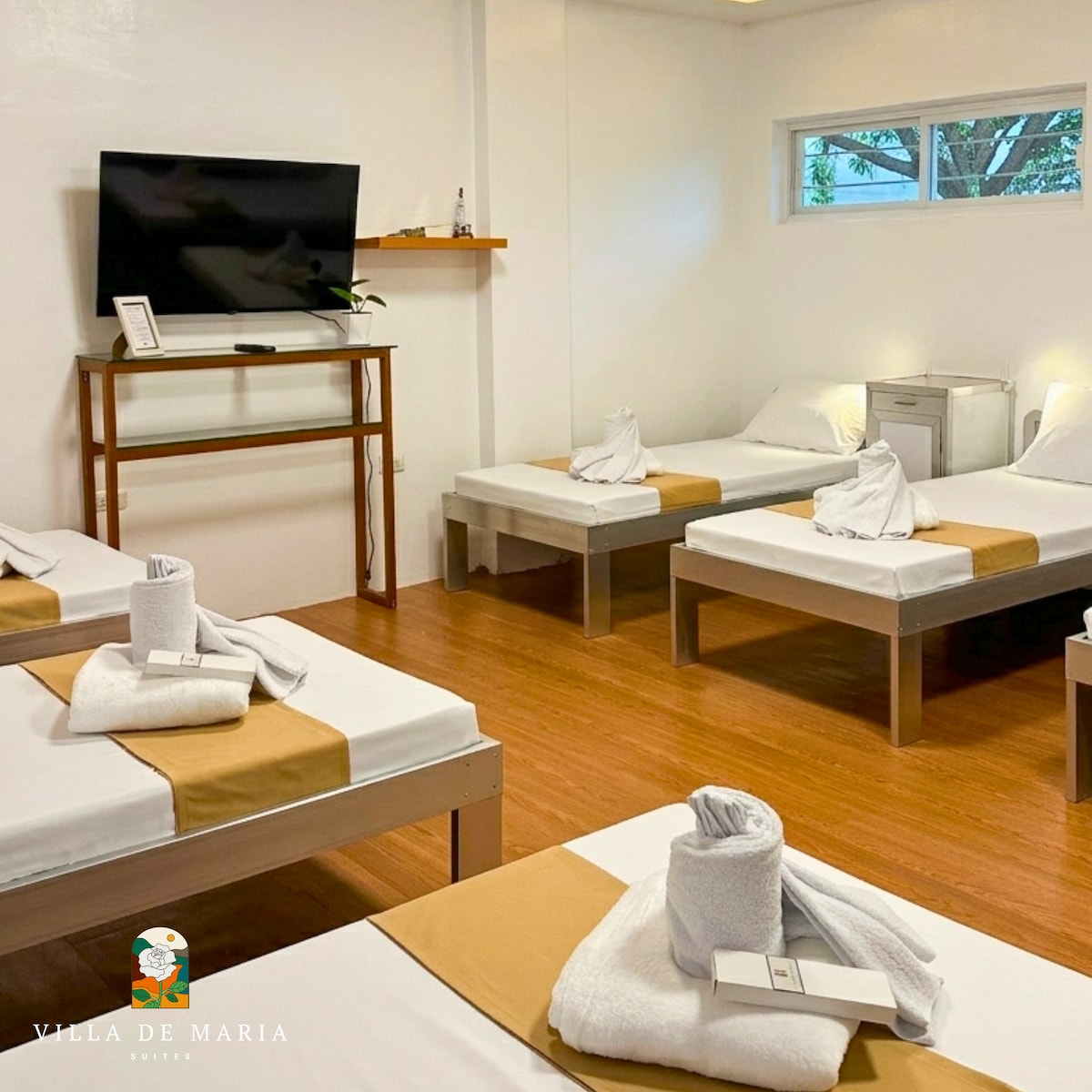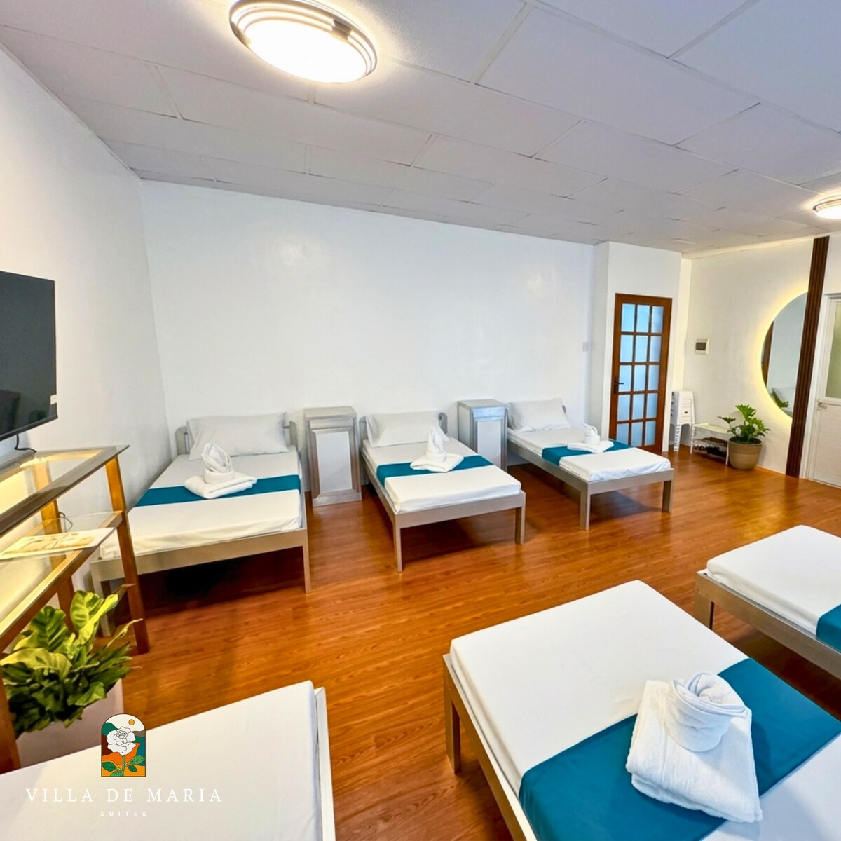Tanzanite Suite of Villa de Maria Suites offers a cozy dorm-style escape perfect for 7–9 guests. Unwind in comfort with a 43" Smart TV, free Wi-Fi, and hot & cold showers complete with towels and toiletries. Enjoy the naturally cool mountain climate, especially at night. Guests have full access to Villa de Maria’s serene amenities—the chapel, gazebo, pond, and gardens—creating a peaceful retreat surrounded by nature’s calm and breathtaking views.