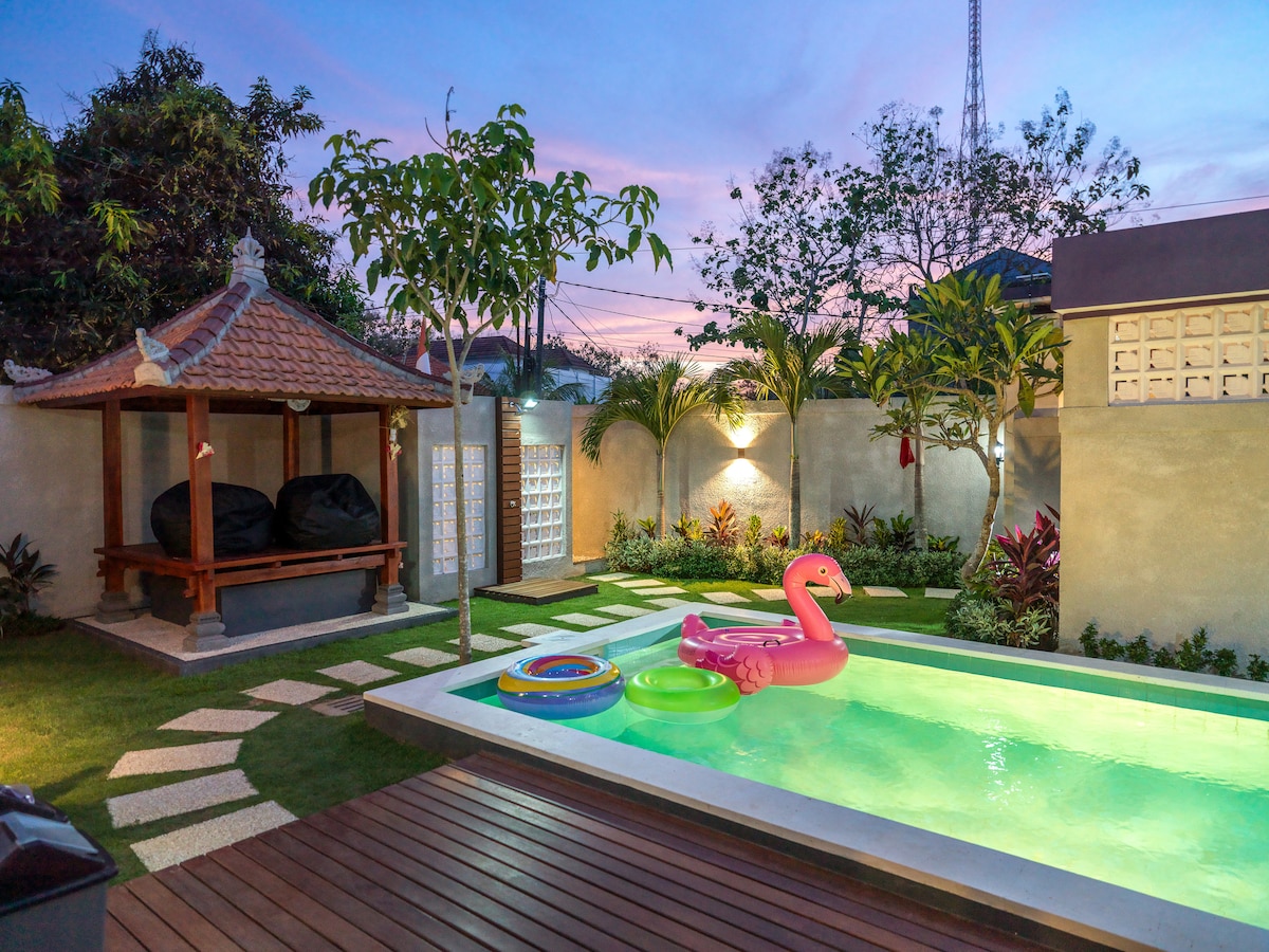 Enjoy your romantic private times in a luxurious complex, close to a fine selection of world-class cafes, restaurants and beach clubs. But perfectly hidden in a serene and quiet villa neighbourhood. This villa features an ensuite bathtub and offers a perfect dip-in pool. Enjoy your floating breakfast under the wood panels with sunlight gently pouring through. Chillax on the bean bag or sun loungers at your choice while soaking up the view of the garden.