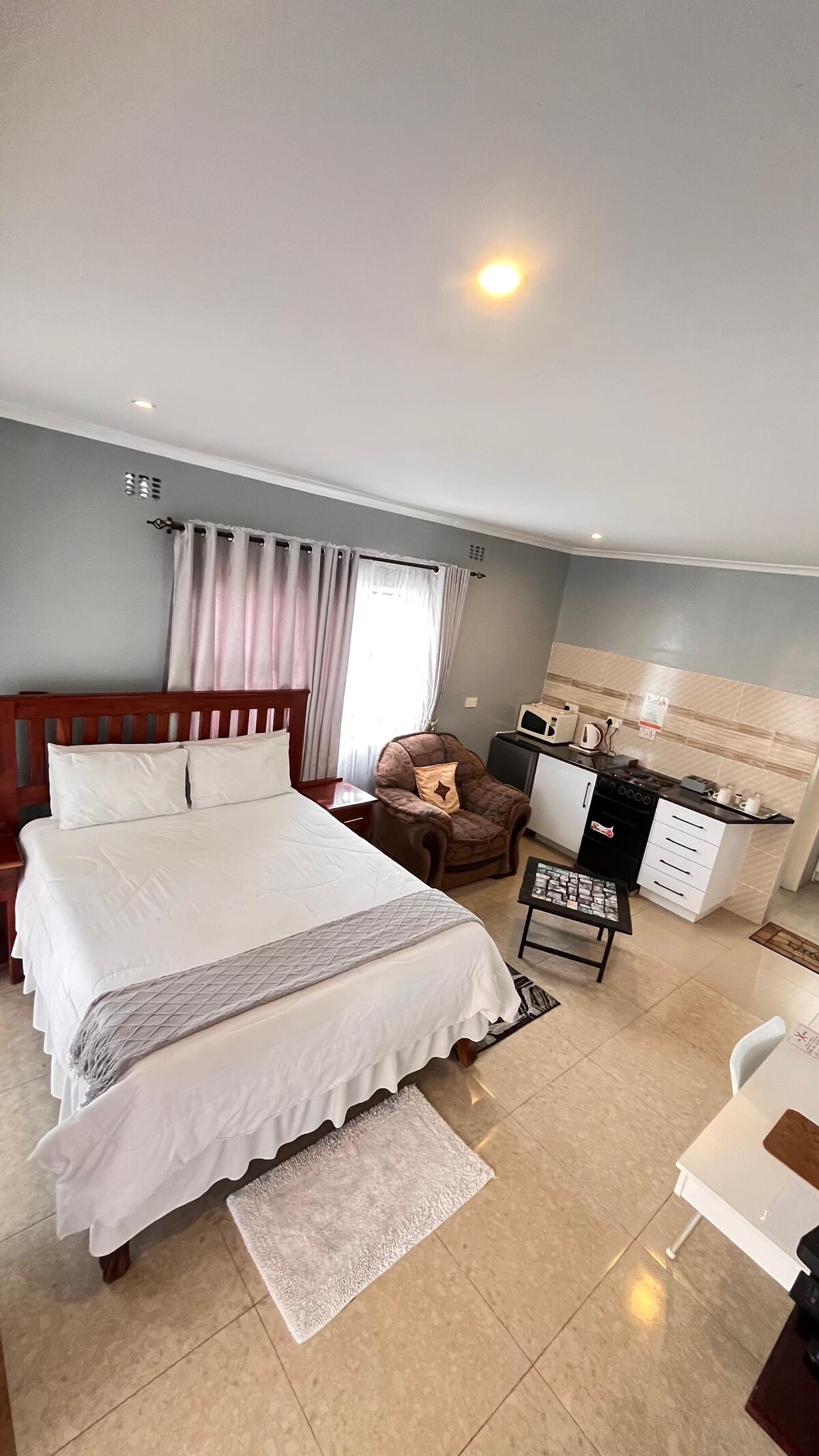Elegendő hellyel két személy számára, kanapé ,hűtőszekrény, ventilátor, konyha tűzhellyel és sütővel. Ez lehet a békés búvóhelyed egy csendes helyen Fourwinds Bulawayóban Dstv & Open View (nem kötelező) WiFi Zuhanyzó Mikrohullámú sütő Vízforraló Evőeszközök Fazekak ,csészék és serpenyők Anti terheléscsökkentési rendszer Vasalódeszka és gőzölős vasaló.