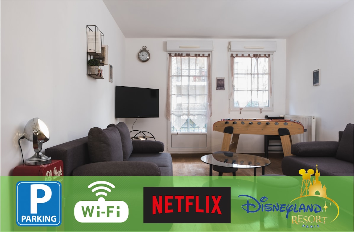Venez découvrir Disneyland et Paris en séjournant dans notre bel appartement de 40m², parfait pour 4 personnes et un bébé. Idéalement situé au pied de la gare (à 20 mètres), vous bénéficierez d'un emplacement exceptionnel avec : À 1 minute de la station RER A. À 8 minutes de Disneyland en RER. À 5 minutes de la Vallée Village (shopping de luxe) en RER. À 5 minutes du centre commercial Val d’Europe (shopping, restaurants, cinéma...) en RER. À 2 minutes du supermarché, boulangerie, restaurants...