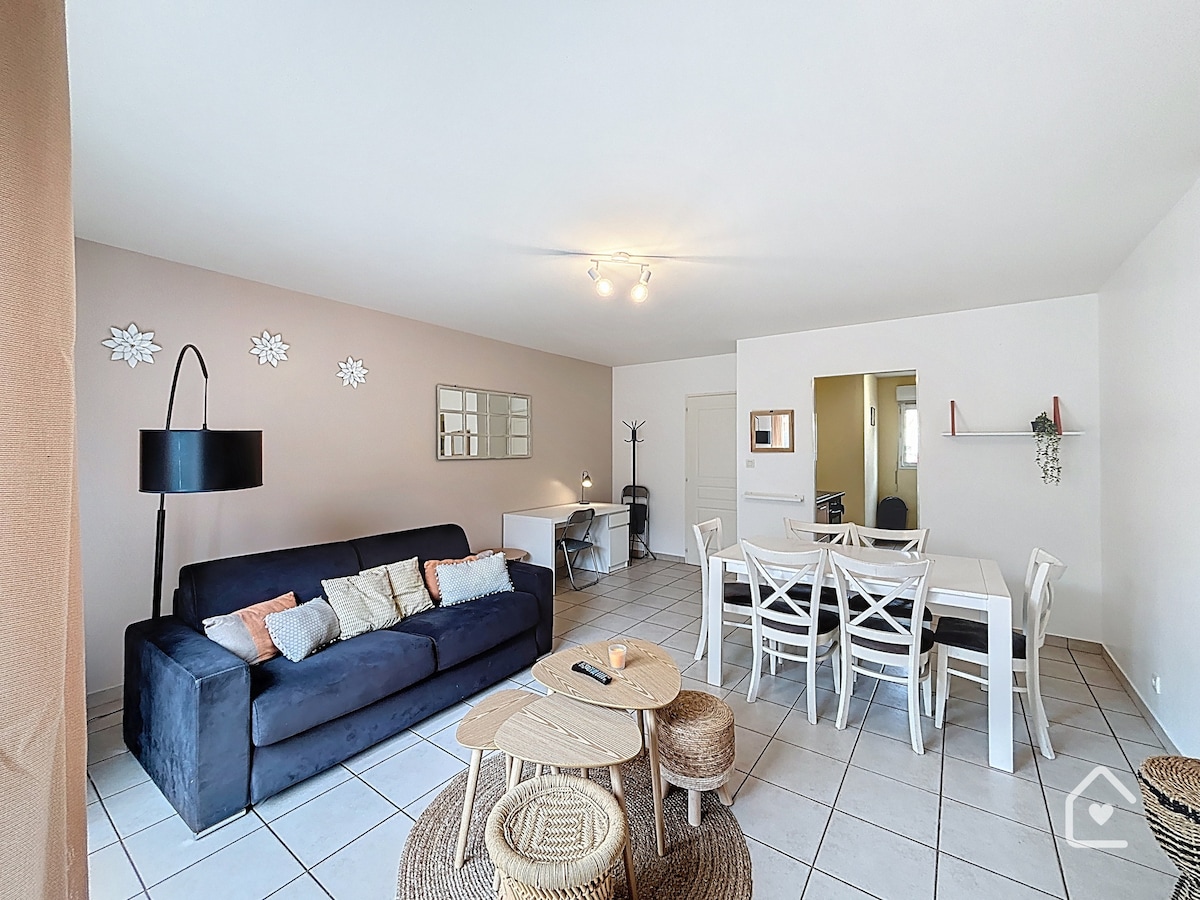 Gyertek, és élvezzétek a kellemes pillanatot ebben a gyönyörű lakásban, amely akár 4 ember elszállásolására is alkalmas, akár üzleti, akár turizmus céljából. 12-14 perc autóval Futuroscope-tól, az Arénától és Poitiers történelmi városközpontjától. Buxerolles városközpontjában, egy csendes rezidencián, közel minden kényelmi szolgáltatáshoz (üzletek, buszok, mozi), egy elkerített kert is vár rád, valamint egy biztonságos és privát parkolóhely az épület alagsorában.
