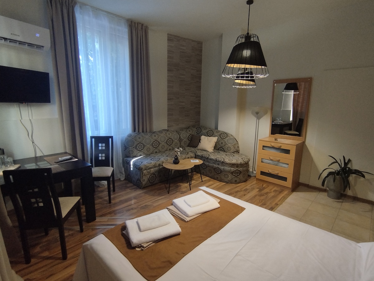 Luxusstúdió Rousse legvonzóbb részén, 50 méterre a Duna folyótól és 2 perc sétára a városközponttól. A stúdió saját fürdőszobával, teakonyhával, étkezőasztallal, íróasztallal, hűtővel, hajszárítóval, vasalóval, vasalódeszkával, mosógéppel, szárítógéppel, teljes evőeszközökkel és poharakkal rendelkezik. A főágy 180x200 cm-es, kényelmes luxusmatraccal. A stúdió a földszinten található, egy újonnan épült épületben, és egy privát teraszra néz.