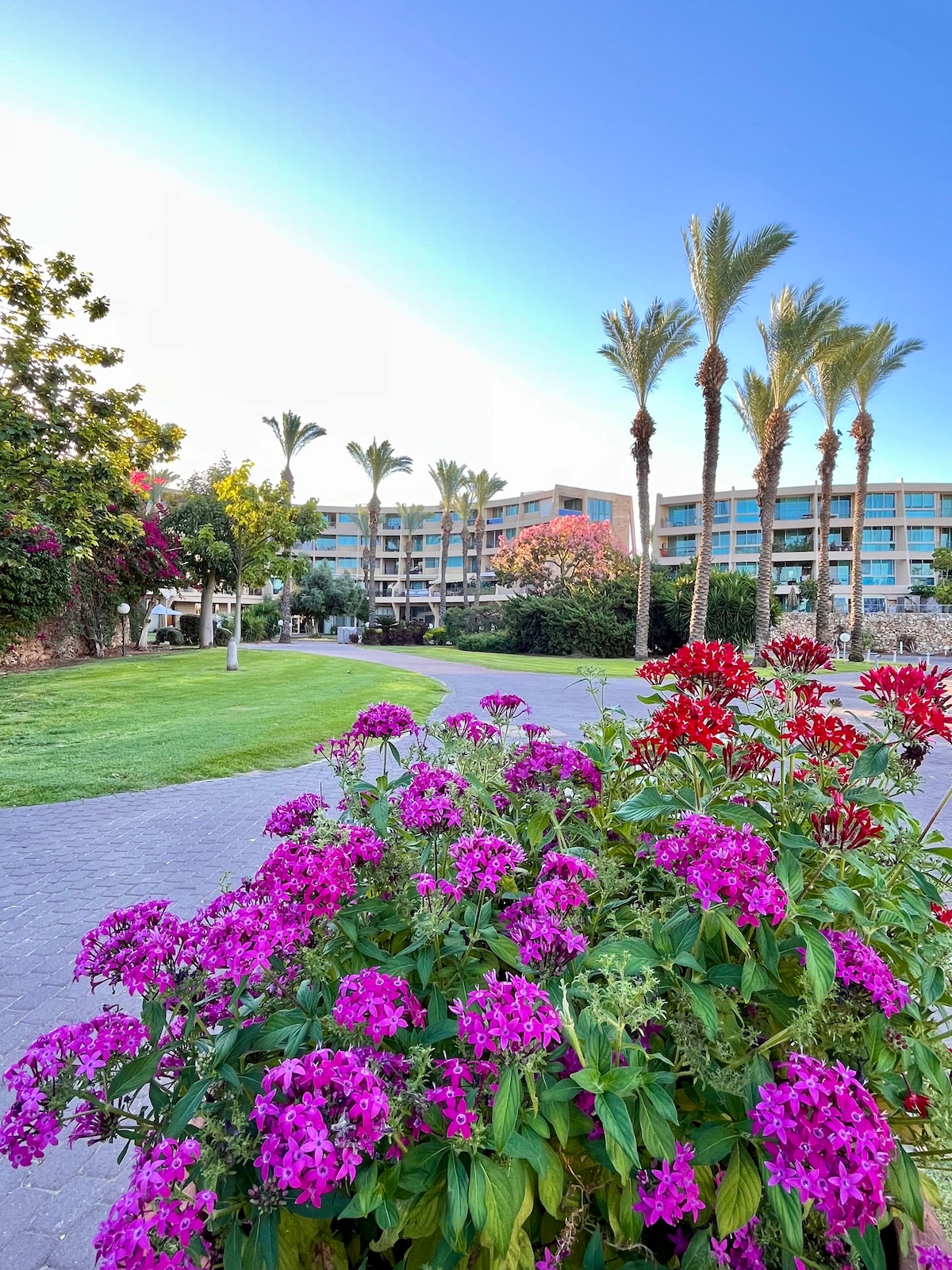 Private luxury apt with sea view at a beautifulll resort. Master bedroom & living room have large windows over ocean view, kids bedroom with two twin beds. The complex includes free swimming pools, jym, squash, tennis cour, lush well-kept gardening and playgrounds. 5 min drive from the old city & There are 2 big shelters in each level of the building. The apt is 15 meter from each of them.