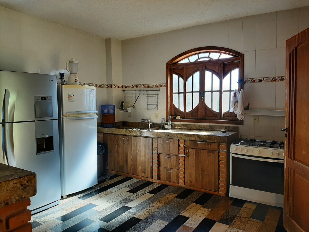 Nagyon gyors és stabil 5G internet, nagyszerű otthoni munkavégzéshez és távmunkához. 10 fős helyszín 4 hálószobával, 2 dámával, 1 franciaággyal, 4 egyszemélyes ággyal, 2 fürdőszobával, TV-vel és játékokkal. Szellőztetett ház, penészmentes, 45 percre a BH-tól. Pergolado hálóval, strandszékekkel és ombrelonokkal. Caeté, Serra da Piedade, Sabará és Ravena közelében. Piscina, barbecue, futevôlei field, golf, snack, totem, fire pit, fish tank, woodstove, full kitchen and bike.