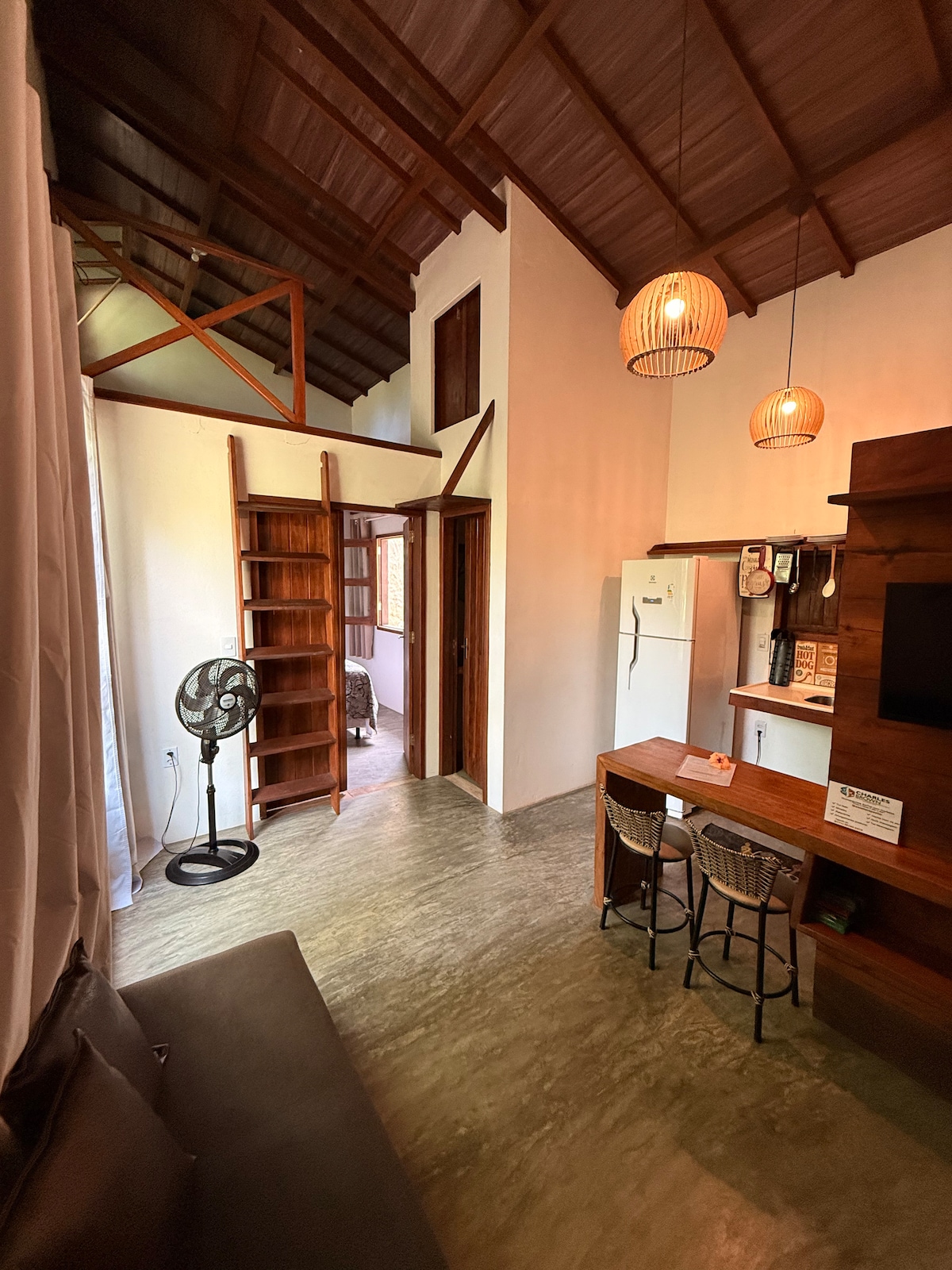 Ez a faház, amely 2 különálló stúdióapartmanból áll (1 a földszinten + 1 az 1. emeleten) egy zöld, 2,300 m2-es területen található, mindössze 70 méterre Gamboa Argila strandjától és körülbelül 2 km-re Morro de São Paulo központjától. Ez a stúdió a földszinten található, és 1-3 fő elszállásolására alkalmas. Független bejárat és varanda függőággyal, kis és bútorozott konyha, 1 kétszemélyes ágy és 1 egyszemélyes ágy, 1 privát fürdőszoba, tévé, légkondicionáló, ingyenes Wi-Fi.