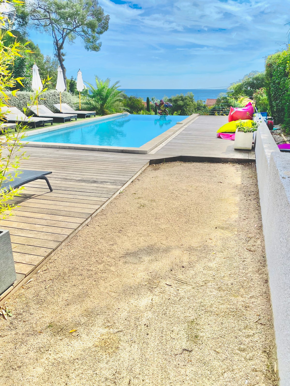 Lenyűgöző, bohém, egyszintes villa végtelenített medencével (áprilistól októberig fűtött), Les Issambresben. Lélegzetelállító 180° -os kilátás nyílik a Saint-Raphaël-öbölre, az Estérel-hegységre és az Alpes-Maritimesre. Egy nagyon csendes környéken található, mindössze 10 perces sétára Les Issambres egyik legszebb öblétől: La Calanque Bonne Eau