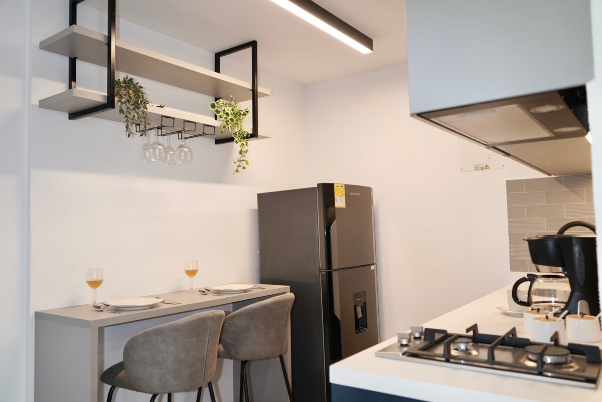 Disfruta de una estadía única en nuestros modernos y acogedores aparta estudios, ubicados en el sur de Cali, con una ubicación privilegiada *Aire acondicionado *Una cómoda cama doble * Baño completo con regadera *Cocina completa equipada con una práctica barra de comedor *Wi-Fi y televisor Disfruta de las vistas panorámicas de la ciudad desde la terraza del edificio. En el barrio encontrarás una amplia oferta de restaurantes, bares, farmacias y tiendas, todo a pocas cuadras de distancia..