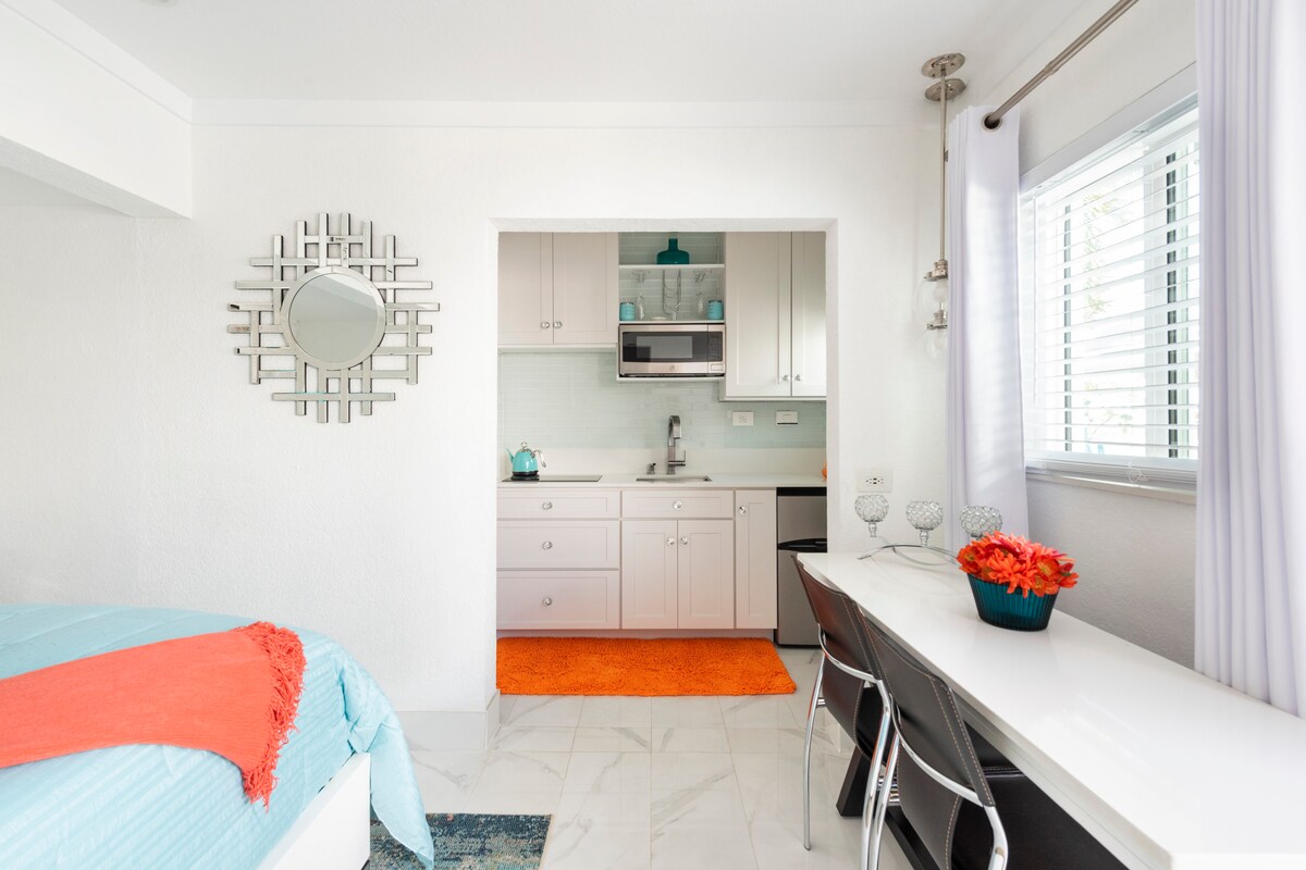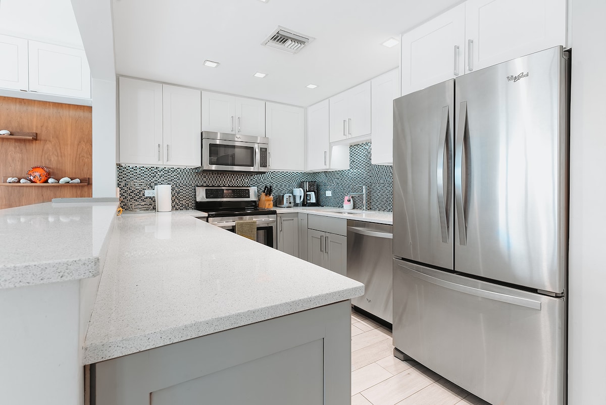Fedezd fel a tökéletes tengerparti menedéket újonnan berendezett, második emeleti lakásunkban, pár lépésre a strandtól. Kényeztesd magad a modern kényelmi szolgáltatásokkal, beleértve a Smeg sütőt, a mosogatógépet és a KitchenAid eszközöket, valamint a síkképernyős TV-t és a nagy sebességű üvegszálas Wi-Fi-t. A tágas nappali és étkező bőven elegendő helyet biztosít a kikapcsolódáshoz. Lazíts a king-size ágyban egy vadonatúj hibrid matraccal és luxuspárnákkal, amelyeket prémium Brooklinen lepedők díszítenek. A modern fürdőszoba felfrissüléssel rendelkezik