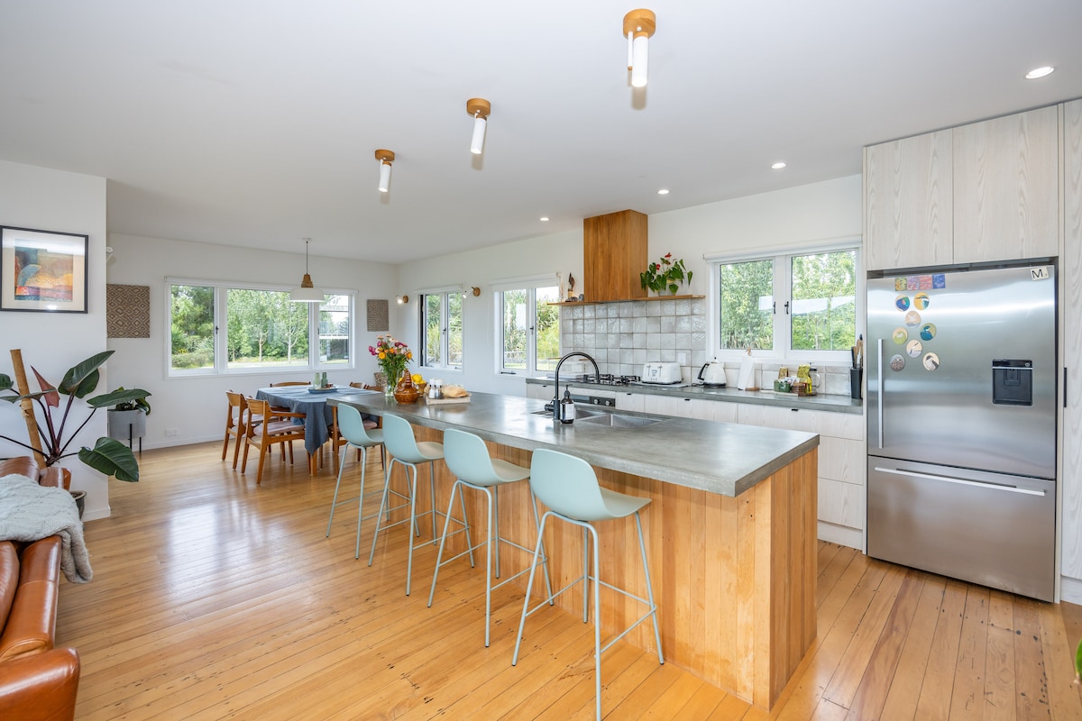 Exceptional home in rural setting 10mins from Hamilton. Views across to Mt Pirongia. Fabulous outdoor/indoor flow. 2 mins from Punnet Cafe, Forever Bound, Mixture, Tieke Golf, Narrows Landing + Gails of Tamahere, market, 4km from airport, Mystery Creek + Fieldays. Easy day trips less than 1hr to Hobbiton, Tauranga, Raglan (surf), Karapiro (rowing, sailing), Waitomo Caves (rafting, glow worms). Pool, putting green, 70sqm pergola in 4 ac. Ideal for family occasions, corporate groups + retreats
