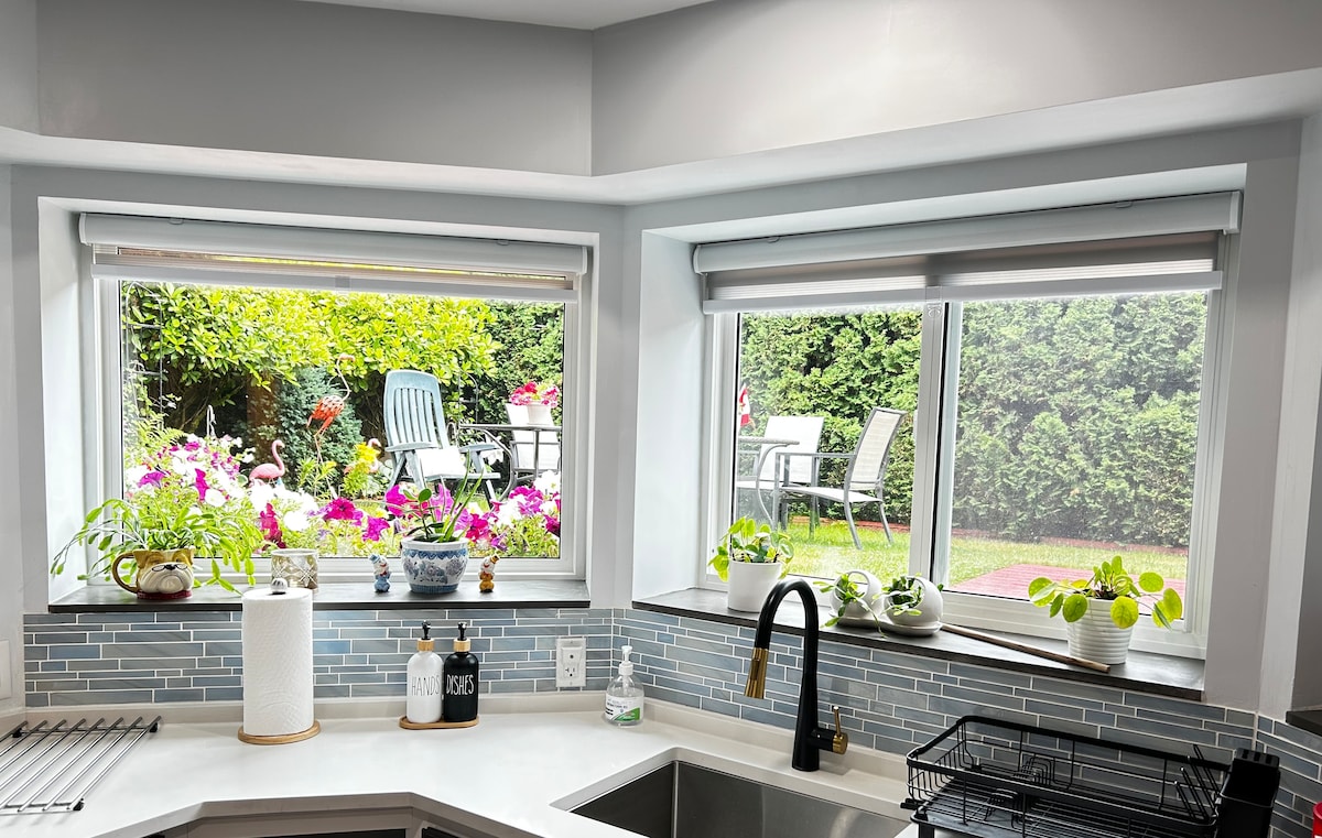 A spacious suite with lovely garden, offers full kitchen, open concept dining/living room area and a private bathroom. Sleep well on a queen bed with fresh white linens and heavenly pillows. Enjoy free wi-fi, watch your favourite Netflix movies in a huge TV with a warm electric fireplace. Morning coffee and bottles of water are complimentary! Located in a quiet neighbourhood with free parking space. 20 minutes drive from/to Tsawwassen Ferry terminal. 30 minutes drive from/to YVR airport.
