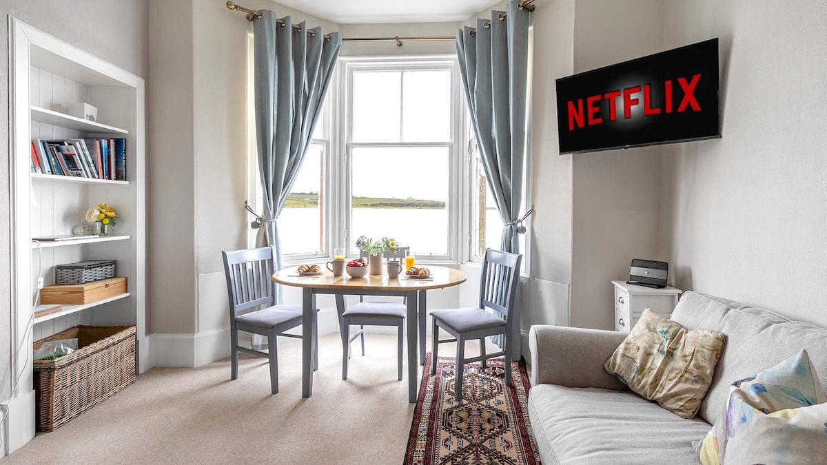 Bay View Beach Apartment is located on the beach in the village of Whiting Bay. A tevékenységek közé tartozik a golfozás, a horgászat, a kajakozás, az úszás és számos gyönyörű ösvény. Az erkélyről a Firth of Clyde-ra és a Szent Szigetre nyílik kilátás, a nyugodt kilátásban pedig a vízen átrepülő hattyúk, a parton lévő osztrigafogók és a vidrák a tengerben. Hideg napokon és éjszakákon egy fatüzelésű kandalló meleg, otthonos légkört teremt. Élvezd a Sky free to air TV-t a nappaliban és a hálószobában. Ingyenes Wi-Fi.