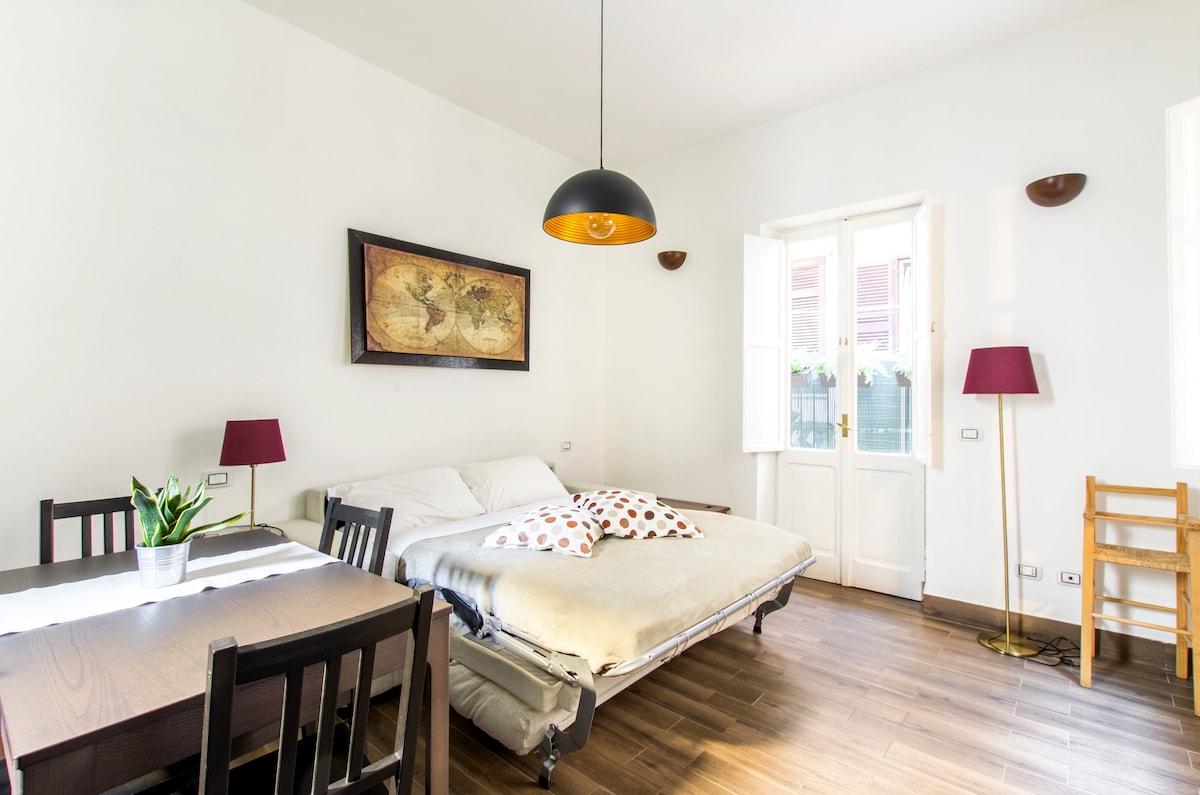 Ez a kis lakás Róma szívében egy olyan hely, amit szeretek, és felejthetetlen pillanatokat adott nekem. Szerintem tökéletes sarok két főnek. Gyalogosan elérheted a központ összes főbb helyét. Ideális két ember számára, mert csak egy hálószobája és egy fürdőszobája van, de kivételesen 4 főnek adom ki, két gyermekes családokkal. A nappaliban két karosszék található, amelyek ágyakká alakulnak. Júliusban és augusztusban élvezd a légkondicionálást!