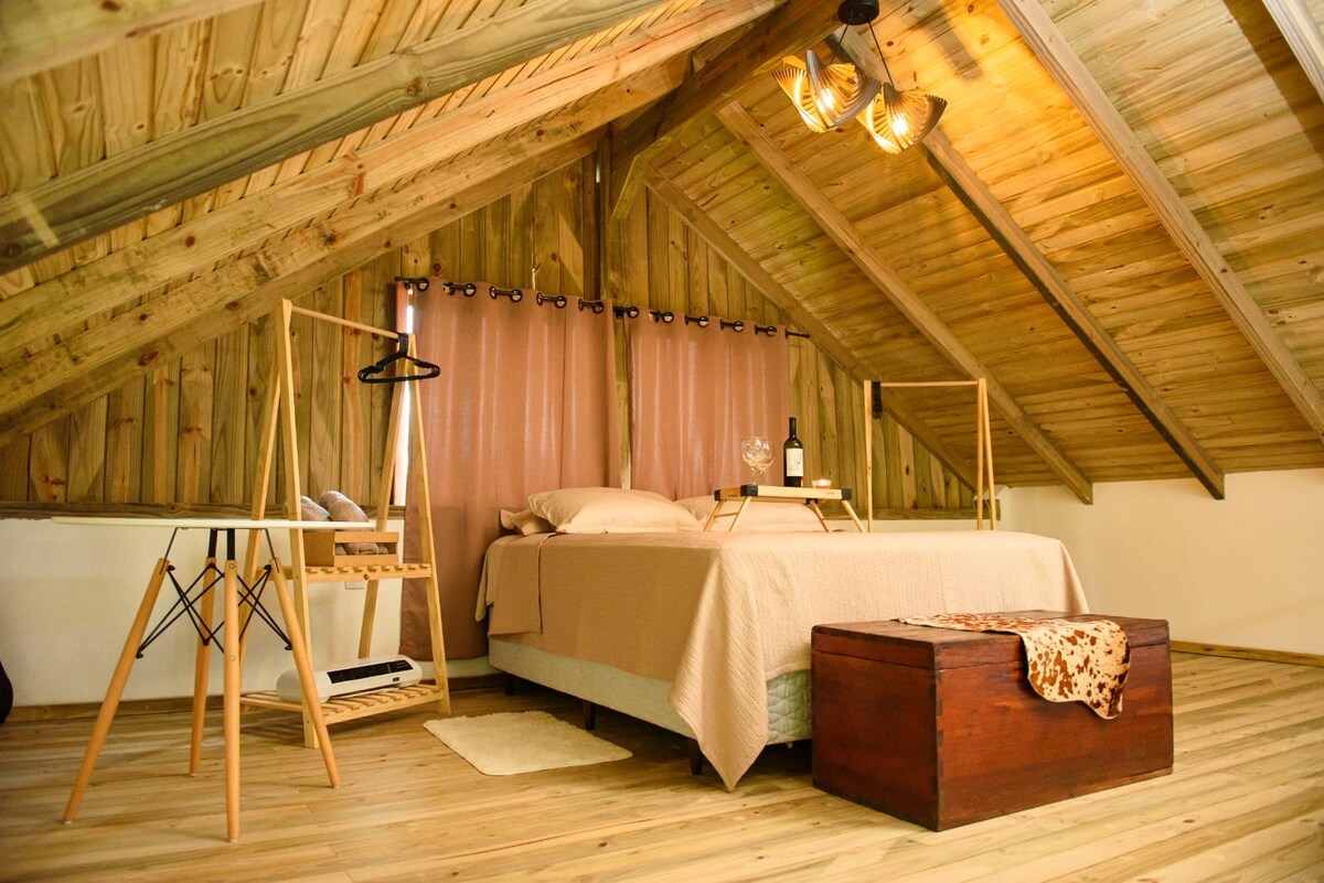 Nenhum detalhe passa despercebido nesta acomodação charmosa e sofisticada. Aqui você terá todo conforto em um ambiente privativo em meio à natureza. A banheira com hidromassagem com vista para o pôr do sol torna essa experiência única. Nossa cozinha completa da a oportunidade de cozinhar suas refeições preferidas.