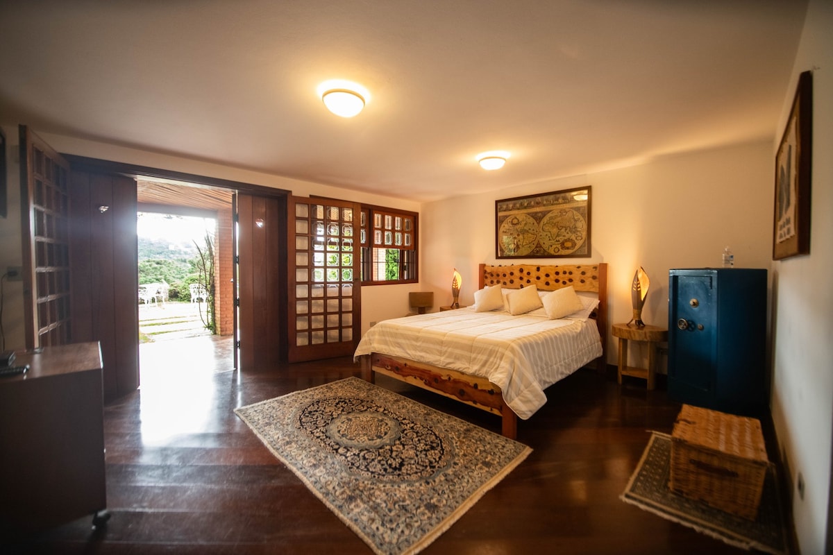 Aconchegante e com vista deslumbrante, a suíte tem estilo sem igual, perfeita para um fim de semana romântico. Como anexo à casa principal, tem entrada exclusiva e toda privacidade. Desfrute do amplo quintal com lounge exclusivo, redário, espaço para fogueira e garagem. Com cafeteira, chaleira, taças e abridor de vinho. Sem frigobar. Caso deseje cozinha, temos a “Casa Vista e Design” que dispõe de sala, cozinha e acomoda até 4 pessoas ;) Nossas 2 cadelas super mansas moram na propriedade*