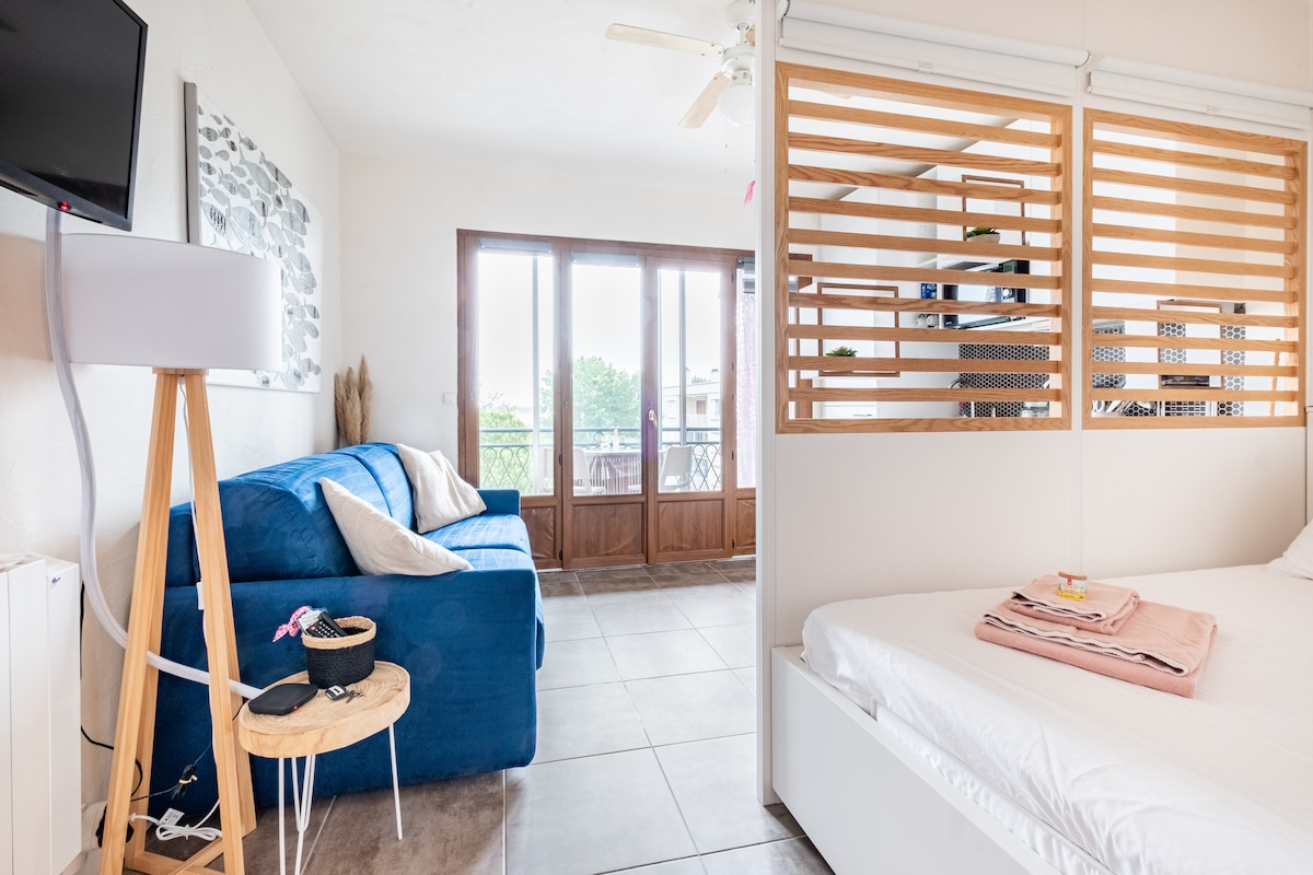 ☀️Pihenj ebben a csendes és elegáns szálláshelyen. ☀️A kikötők szívében szép, 20m2-es stúdió és terasz gyönyörű kilátással a kikötőre, 3. emelet (lift nincs). 2 felnőtt vagy 1 felnőtt és 1 gyermek számára ☀️Egy gyönyörű teraszra nyíló nappaliból, légkondicionálóból, teljesen felszerelt konyhából, Nespressoból, hűtőből, mosogatógépből, mosógépből, elektromos sütőből, mikrohullámú sütőből áll... ☀️8 perc sétára a strandtól és az üzletektől ☀️Privát parkolás és ingyenes WI-FI 🏊♂️MEDENCE MÁJUS 15-TŐL szeptember 30-ig tart NYITVA