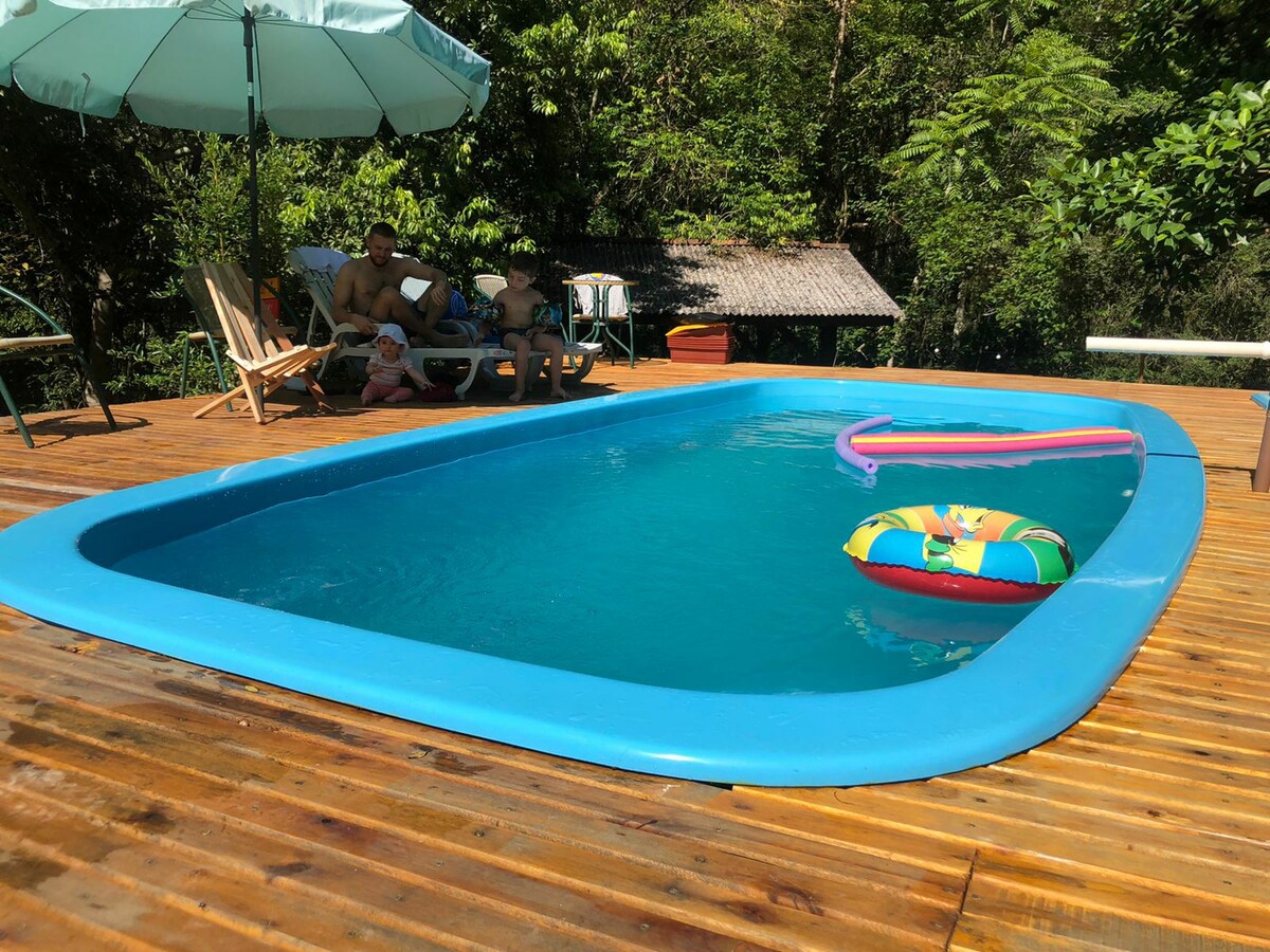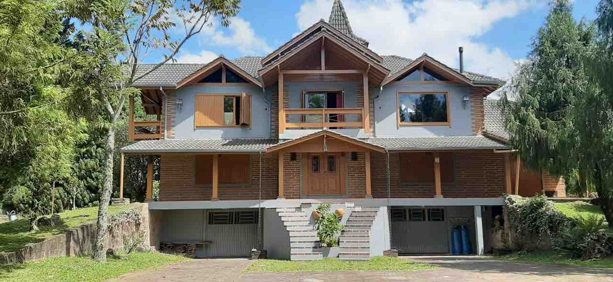 Víkendház (12 fő) - 7 km-re a belvárostól Természet és gyönyörű kilátás a következőkkel: >01 en-suite + 02 hálószoba + félemelet >Nappali dupla magassággal, kandalló és tévé Netflix-szel >Teljesen felszerelt konyha grillezővel és fatüzelésű tűzhellyel > Teljes Enxoval >Légkondicionálás a szobákban >Hajszárító >Vasaló és mosógép > Wi-Fi-internet-rádió >Kioszk úszómedencével, parrillával, tárolóval és fürdőszobával > Kültéri kandalló >Játszótér, homokos röplabda/strandtenisz, focipálya >Parkolás