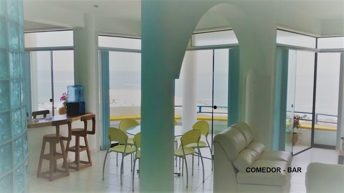 Departamento de 190 metros cuadrados, segundo piso primer piso es el lobby, totalmente equipado y super seguro; El departamento está frente al mar con una bella vista.; también tiene a su disposición: Wifi Jacuzzi con vista al mar Piscina para adultos y niños Cancha de tennis y frontón Zona de golf Cancha de fútbol 5v5 Area de parrilla y fogata Área de juegos para niños Restaurante y bar solo en temporada de verano. Sin sabanas, solo cubrecamas y almohadas.