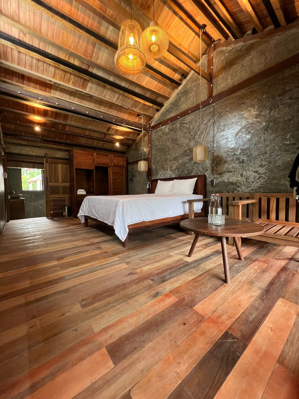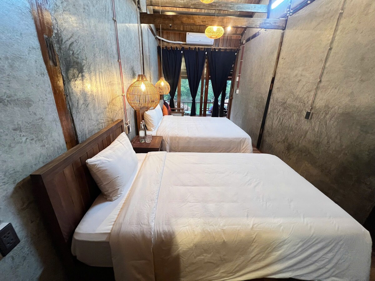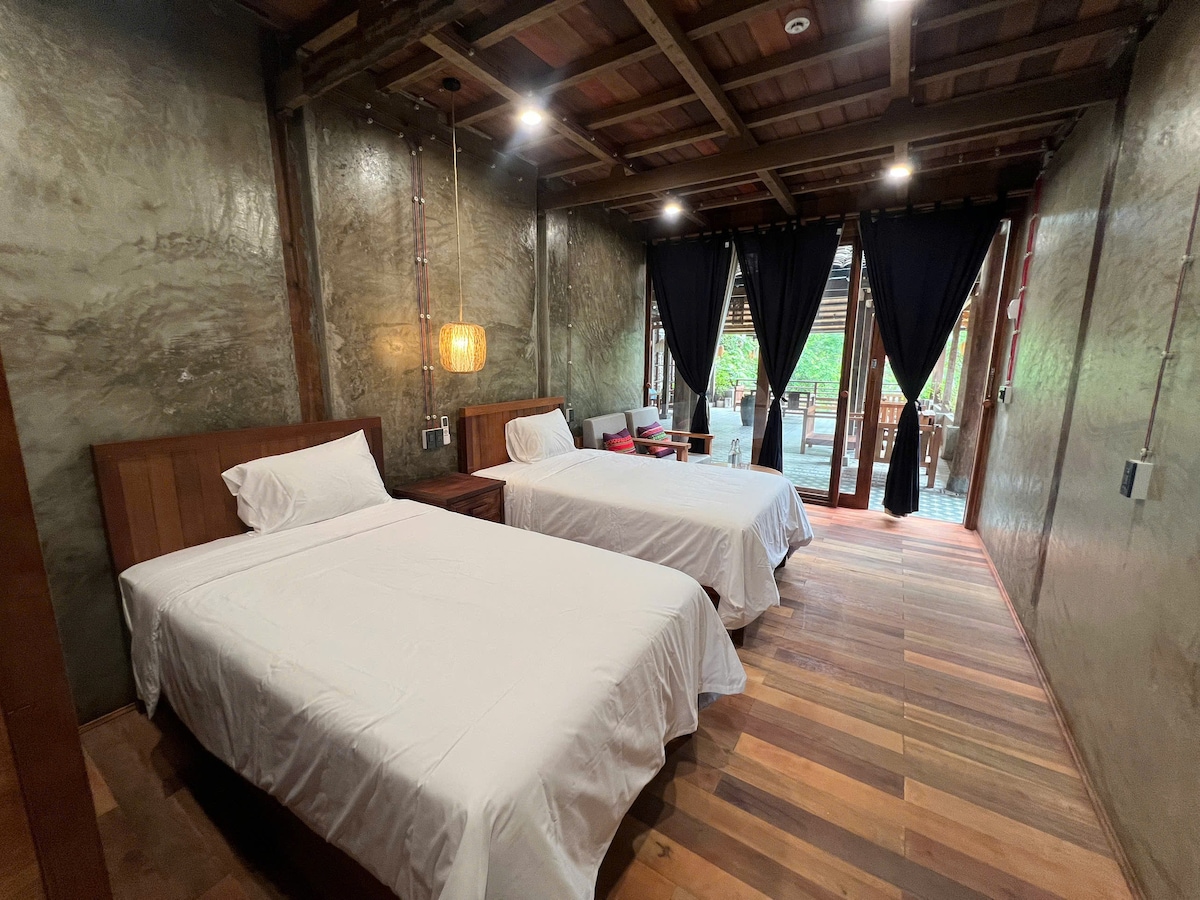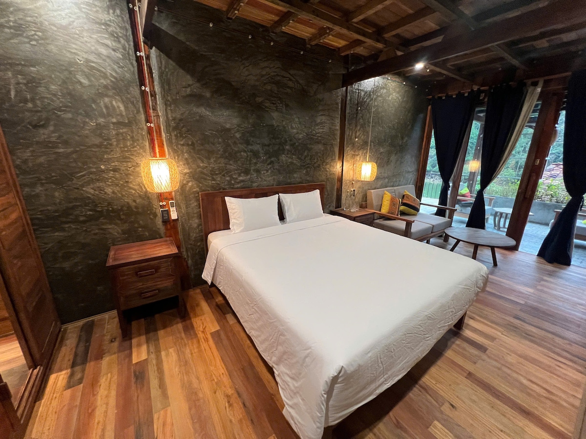 A bright and spacious double room featuring floor-to-ceiling windows with stunning mountain and sunset views. The warm terracotta wall and wooden furniture create a cozy and relaxing atmosphere. Natural light fills the room all day, making it perfect for rest or remote work.