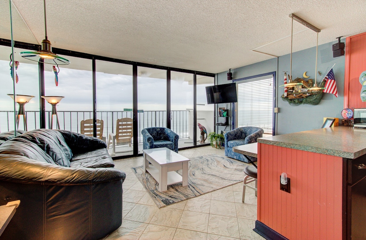 Beautiful condo located in the Caravelle Resort in Myrtle Beach, SC, all the amenities of home with a big ol' dose of SALT AIR added in for that ultimate relaxing getaway, open floor plan, private bedroom with KING size bed with a walk-in closet, private bath, open living room dining room, the living room has a full-size Murphy bed, full kitchen w/stove, fridge, microwave, pendant lighting over bar, private balcony with beautiful ocean view.