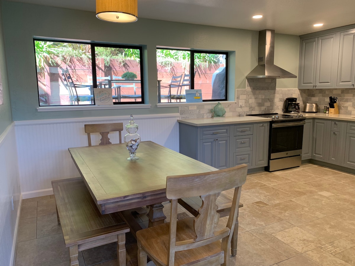 Gyönyörűen felújított 2 hálószobánk (mindkettő az emeleten) és 2 teljes fürdőszobánk (az egyik a földszinten, a másik az emeleten), valamint egy földszinti plüss queen kanapé és egy földszinti nagyszerű szoba étkezővel 7 fő számára, valamint egy bárasztal, amely elválasztja a konyhát a nappalitól. Sétálj le a strandra, üzletekbe, éttermekbe vagy egy kellemes sétára a folyó mentén. A Capitola Village-ben vagyunk. Bízunk benne, hogy kellemes időtöltést kívánunk. Ha kérdésed van, azonnal válaszolunk.