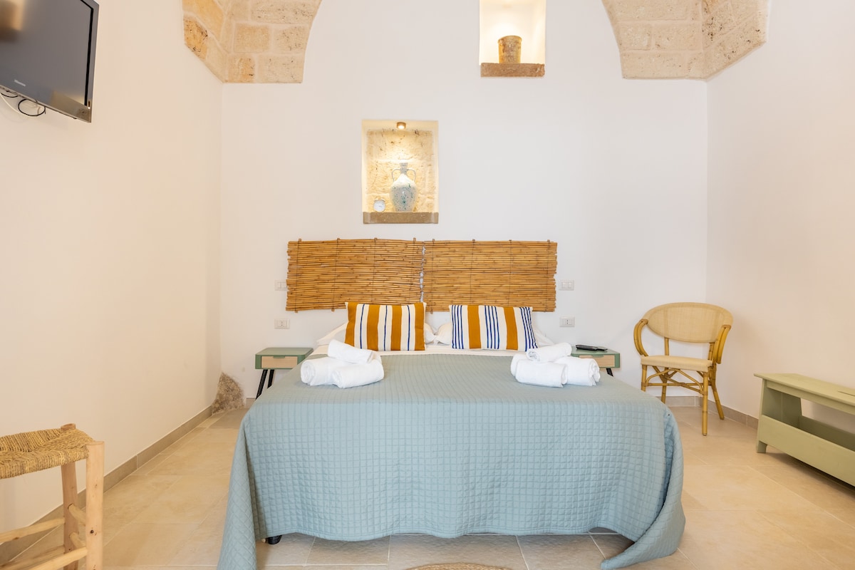 CIS: BR07401291000000188 CIN: IT074012B400033730 Vivi la magica sensazione di trovarti tra passato e presente: è una dimora storica! I pavimenti d'epoca e le pareti in pietra fanno da sfondo a un ambiente arredato con oggetti di design, vecchie ceramiche e mobili locali. L'ampio terrazzo privato, con solarium e doccia calda, saprà entusiasmarti: potrai rilassarti con un bicchiere di vino al tramonto, godere del sole su comodi lettini o preparare una cena in una magica atmosfera pugliese.
