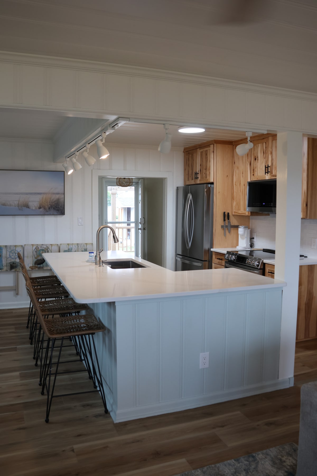 Elbűvölő vendégház a történelmi Beaufortban. Két háztömbnyire a Front St-től üzletekkel, éttermekkel, gyönyörű hajókkal és vízparttal! Privát parkolás és hozzáférés egy téglafalú ösvény mentén, angol kerttel körülvéve. Belül található egy tágas nappali 50hüvelykes TV-vel, teljes konyha, teljes fürdőszoba csempézett üvegzuhanyzóval és egy tágas hálószoba beépített emeletes szobával. Van egy privát terasz, ülőhellyel, egy tűzrakóhellyel és egy 3 házzal arrébb horgászáshoz, rákászáshoz, kajakozáshoz és úszáshoz!