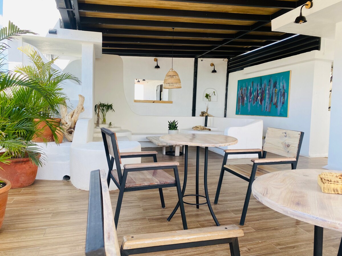 Világos loft lakosztály saját terasszal a Fixie Lofts Colonial Villa Suites-ben. Ez a loftlakás két különálló, világos területtel rendelkezik. A hálószoba saját fürdőszobával rendelkezik, és egy nagy, kertre néző privát erkélyteraszra nyílik. Aztán egy étkező és egy ipari stílusú konyha. Nyugodt kertünk és medencénk privát villahangulatot biztosít kiváltságos helyen. A Condé Nast Traveler és az AD magazinban is szerepeltünk, és egyedi élményt kínálunk. Nézz meg más loftlakásokat is az Airbnb-profilunkon.