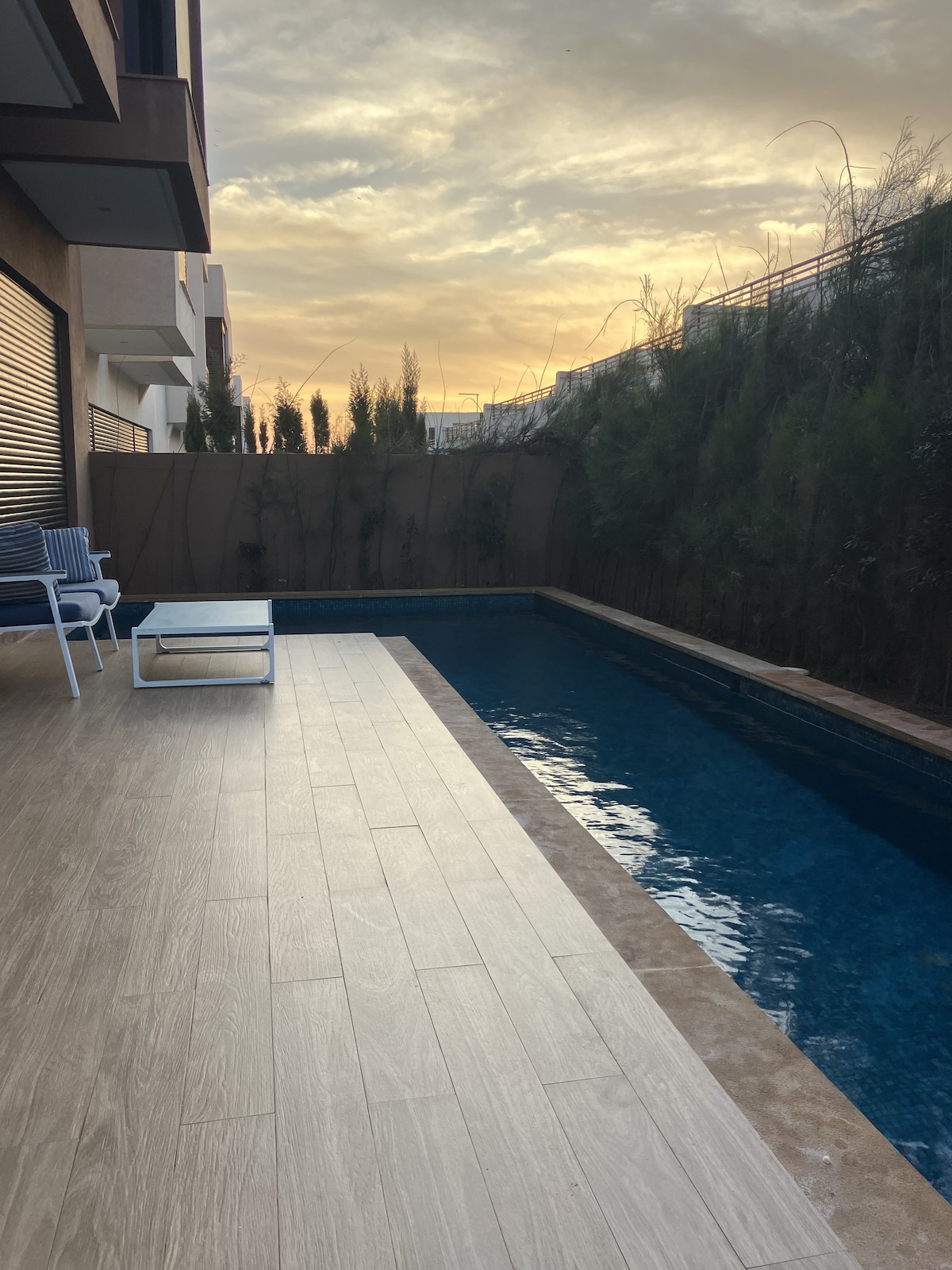 Luxueuse Villa avec piscine très calme dans une résidence sécurisée avec beaucoup de verdure et avec un espace de jeux pour les enfants , pas loin du centre ville et accessible à pied du Morocco Mall et de la plage. 3 suites avec salle de bain privée chacune. Un salon marocain, un séjour convivial et un salon européen élégant avec cheminée . Jardin intime avec piscine et barbecue Rooftop avec Barbecue et vue imprenable sur la mer pour vos soirées d été Deux places de parking couvertes