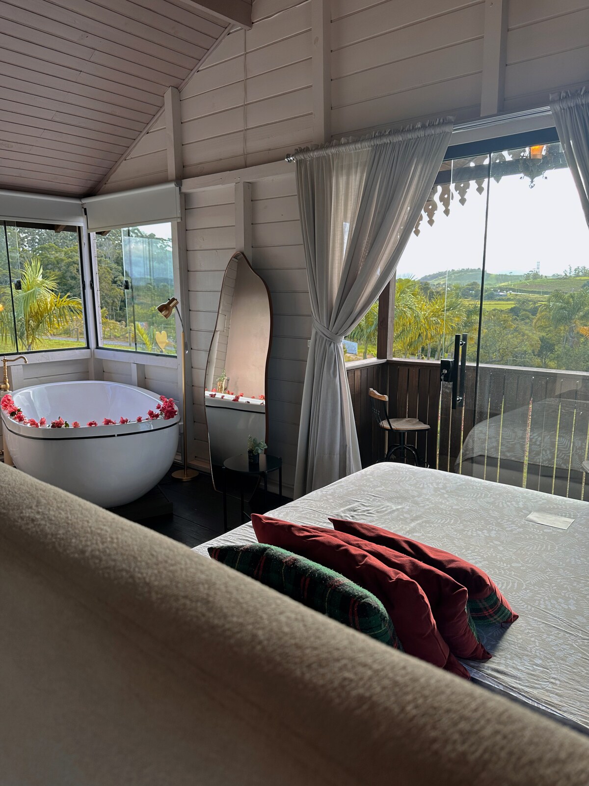 A cabana @oranchodacolina conta com: Cozinha totalmente equipada, micro-ondas, forno elétrico, liquidificador, torradeira e air fryer. Oferecemos tb itens essenciais como sal, açúcar, azeite. A cama queen é super confortável com roupas de cama e banho são de primeira qualidade. Ar condicionado quente e frio, proporcionando conforto térmico em qualquer estação do ano. Banheira de imersão com sais de banho. E no banheiro, chuveiro e torneiras aquecidas a gás com uma linda vista para a natureza.