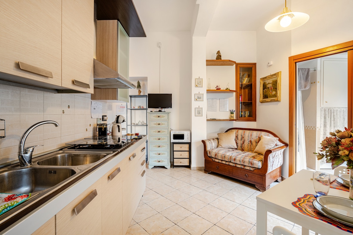 A refined studio apartment just renovated and furnished within an ancient building with an independent entrance. The apartment is located at few meters from the train station and the main street of Albano Laziale. Ideal for a holiday, you can visit the entire town by walking. Equipped with television, air conditioning, independent heating, washing machine, double bed, wardrobe, complete kitchen, space to eat and bathroom with large shower for two people.
