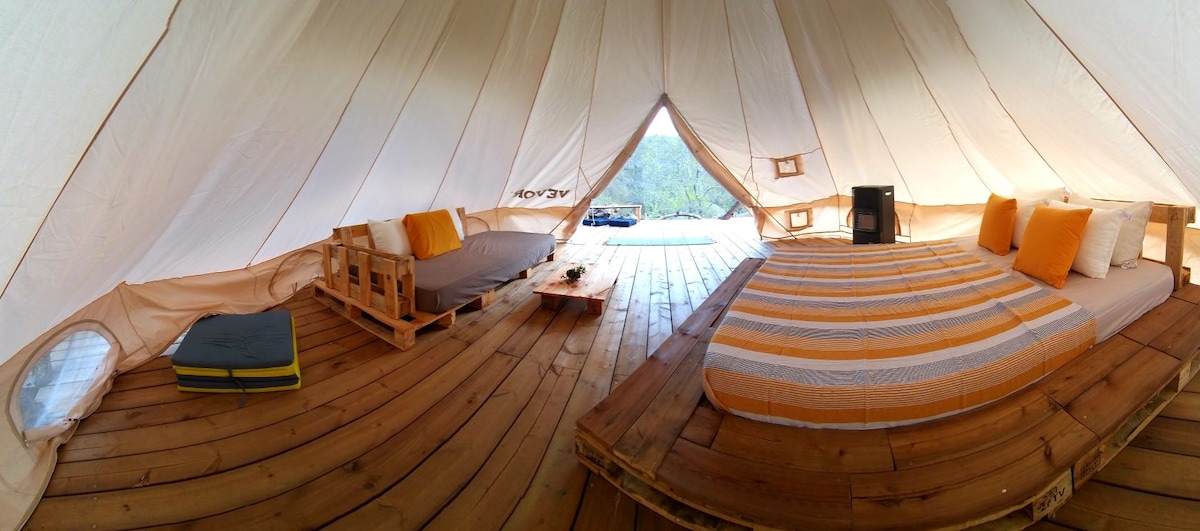 A folyóparton álló harangsátrunk egy békés mezőgazdasági völgyben rejtőzik, és ritka lehetőséget kínál arra, hogy lelassíts, kikapcsolódj, és elmerülj a természetben. Mindössze 50 méterre a folyótól, egy rövid sétára egy rejtett úszóhelytől, madárdalra ébredhetsz, a csillagok alatt aludhatsz el, és élvezheted a hálózat nélküli élet egyszerűségét. 5 perc sétára a helyi folyóparti strandtól, ahol kávézó/bár is van 1,8 km-re Serpins falu központjától és a buszmegállótól (óránként járnak a buszok Coimbrából)