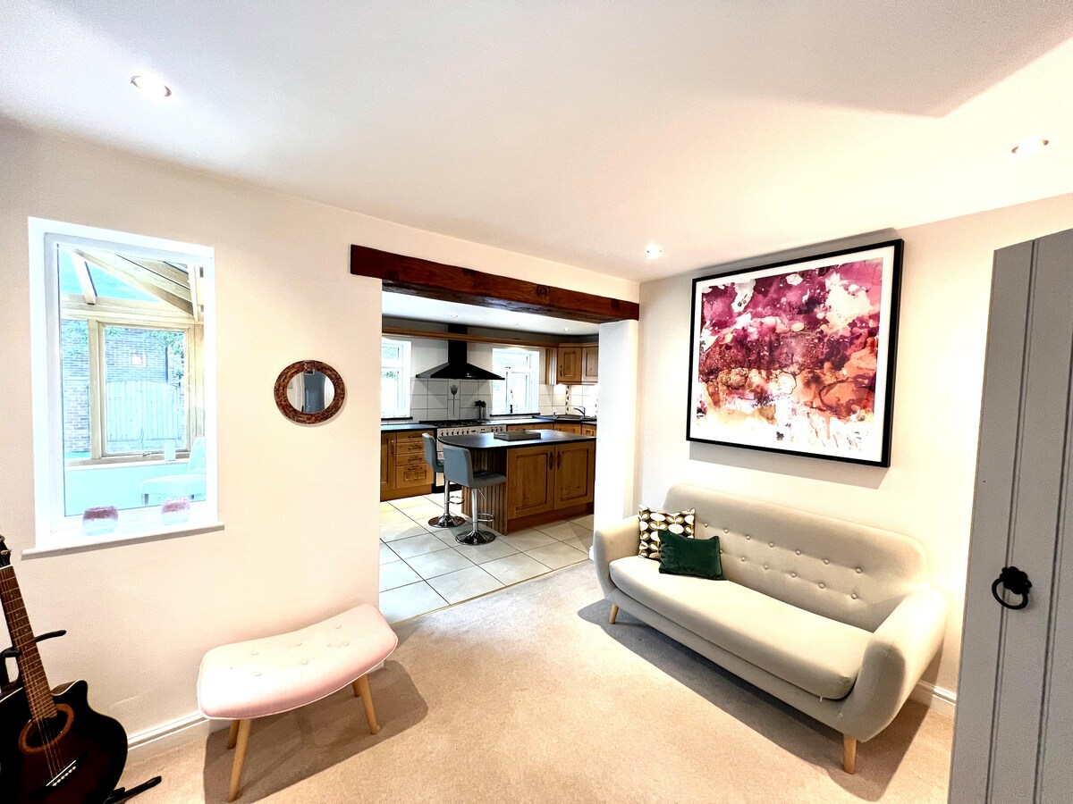 Üdvözlünk bájos kis házikónkban, amely a Castle Donington szívében található, egy kellemes, otthonos ingatlanban, amely meleg és hívogató légkört biztosít, eredeti jellemzőkkel kiegészítve a modern stílusjegyekkel. Központi elhelyezkedésű, 1 perc sétára a főutcától. A Donington Park Race Track és az East Midlands repülőtér közelében. A SkyLink buszmegálló 2 perc sétára van, délelőtt 20 percenként, délután óránként indul, közvetlenül a repülőtérre, Derbybe, Loughboroughba és Leicesterbe. Ingyenes üveg pezsgő a legalább 2 éjszakás foglalásokhoz ☺️