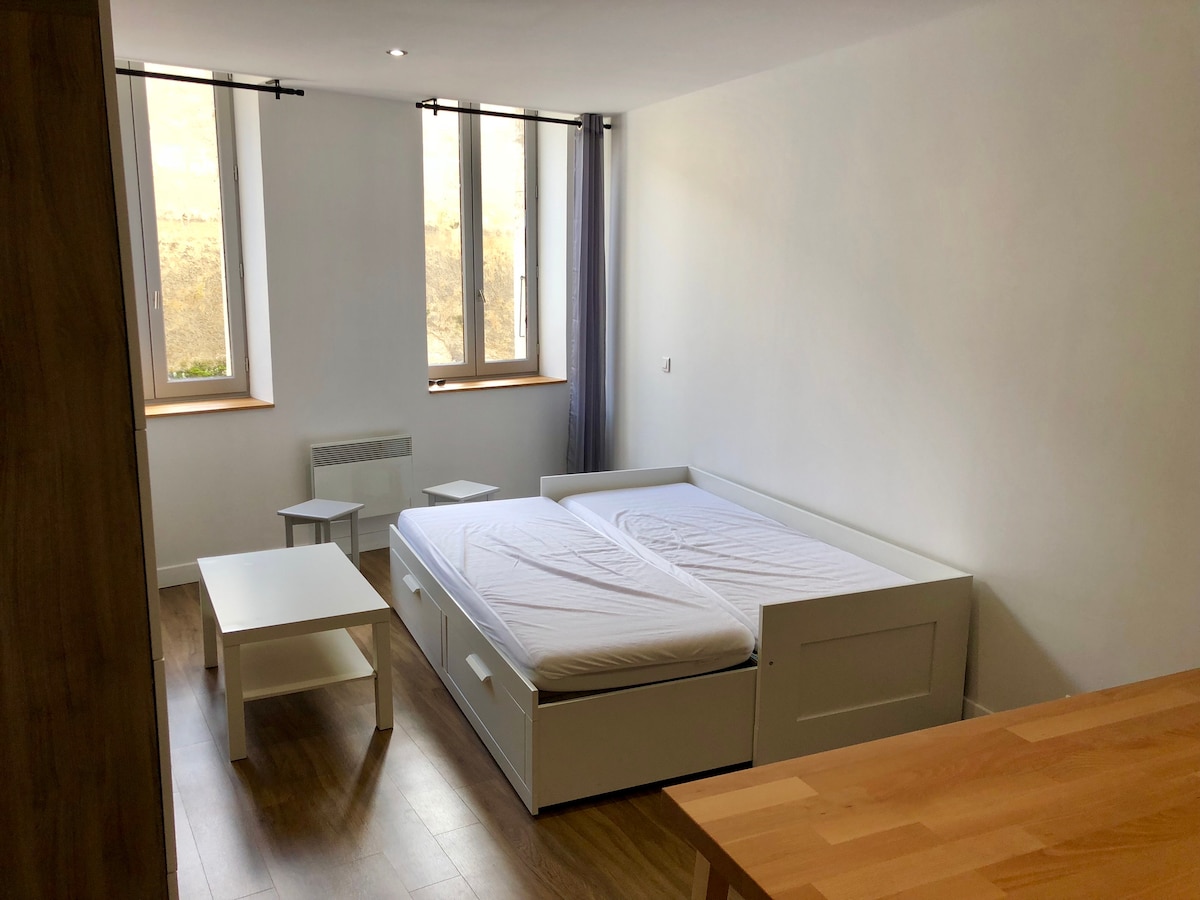 Stúdió 31m2 kínál a lehetőséget, hogy szabadon mozoghat a városban, autó nélkül, minden kényelmi lábánál a lakás, 300m a katedrálistól, 150m nyilvános parkoló, 950m a vasútállomástól, 200m egy szupermarket. Felszereltség: -Egy nappali ággyal 1 vagy 2 helyekre, egyszer nyitott, TV, internet, konyha, kerámia főzőlap, páraelszívó, mikrohullámú sütő, hűtőszekrény és sütő. - És egy zuhanyzó olasz zuhanyzóval, mosdó szekrény, tároló szekrény.