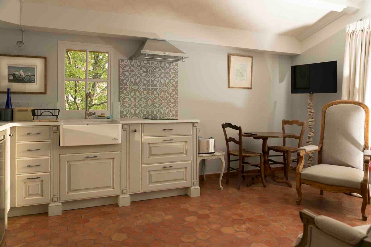 Rendelkezésükre áll egy modern stílusú apartman (Plancha, zuhanyzó, 160X200 ágy, ágynemű és törölköző biztosított). Teljes függetlenség saját terasszal és jacuzzival. A parkban egy kellemes medence is rendelkezésre áll. Ez a kellemes környezetben körülvett természet fészkelt 16 percre Aix en Provence és 30 km-re a tengertől. Sport- és vízközpont a közelben található.