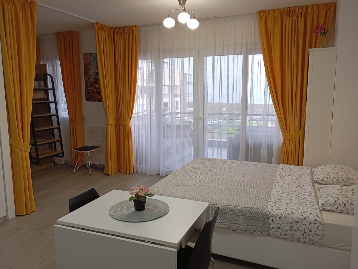 Hangulatos stúdió minden kényelmi szolgáltatással a tengerparton(500 m). Nagy úszómedence-komplexum, szauna, edzőterem ingyenes (2 hétnél idősebb vendégek számára). Az apartman télen és nyáron is folyamatosan kényelmes hőmérsékletű (meleg padló/légkondicionálás), nincs nedvesség vagy penész. Van egy nagy szabadtéri terasz, kilátással a tengerre. Egy csodálatos kávézó kávéval és süteményekkel, egy perc sétára található élelmiszerbolt. Tengerparti sétány kávézókkal,édességekkel és frissen facsart gyümölcslével.
