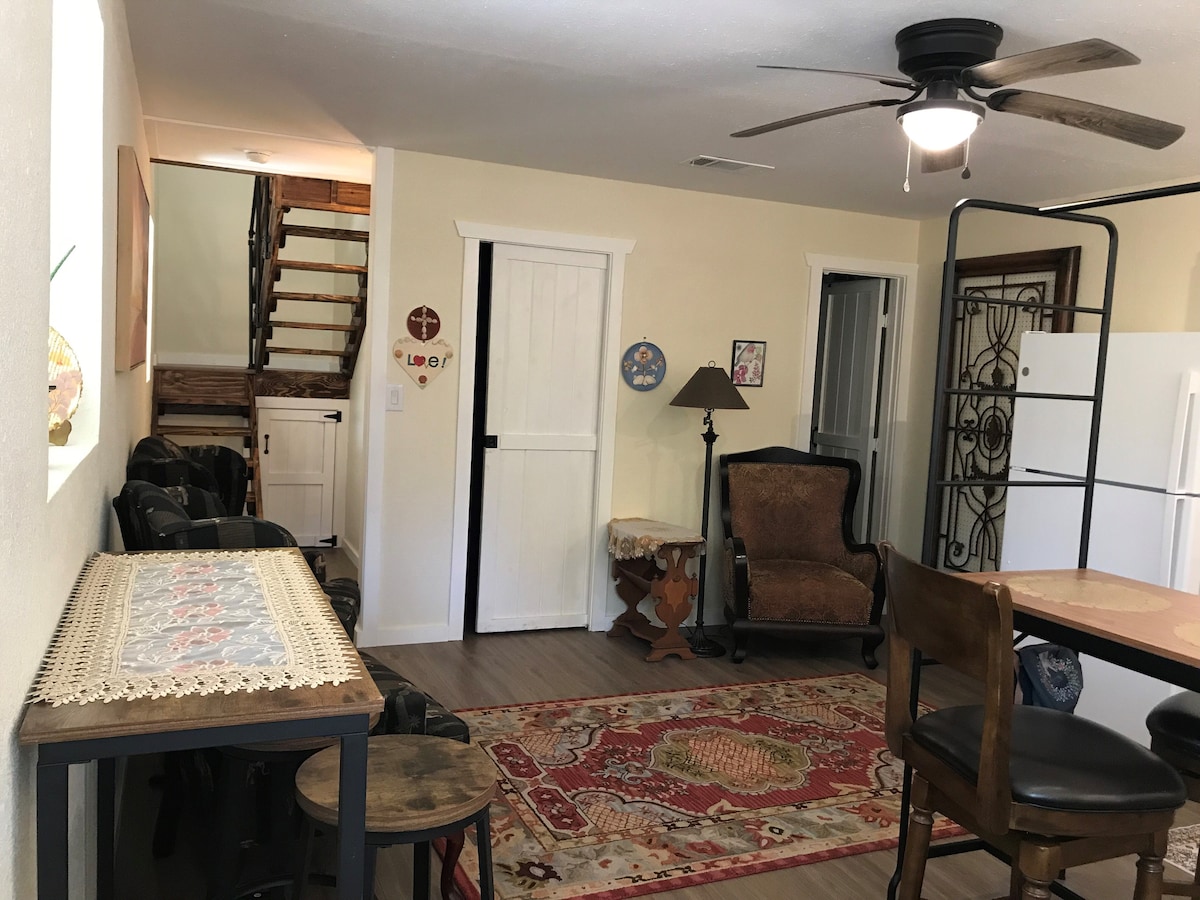 Üdvözlünk a „Little Ass Apartment” programban, amely 28 hektáron helyezkedik el 3 mini szamárházigazdával. Ebben a lakásban minden megvan, amire szükséged lehet a beltéri vagy kültéri pihenéshez. Van benne konyha, nappali, fürdőszoba, mosógép/szárítógép és tágas hálószoba. A szabadban egy nagy kerítés található az udvaron, egy tűzrakóhely ülőhellyel, valamint egy tornáccal, ahonnan kilátás nyílik a napkeltére és a napnyugtára! Élvezd a hátsó udvar szórakoztató területét mosógéppel és kukoricával töltött lyukkal!