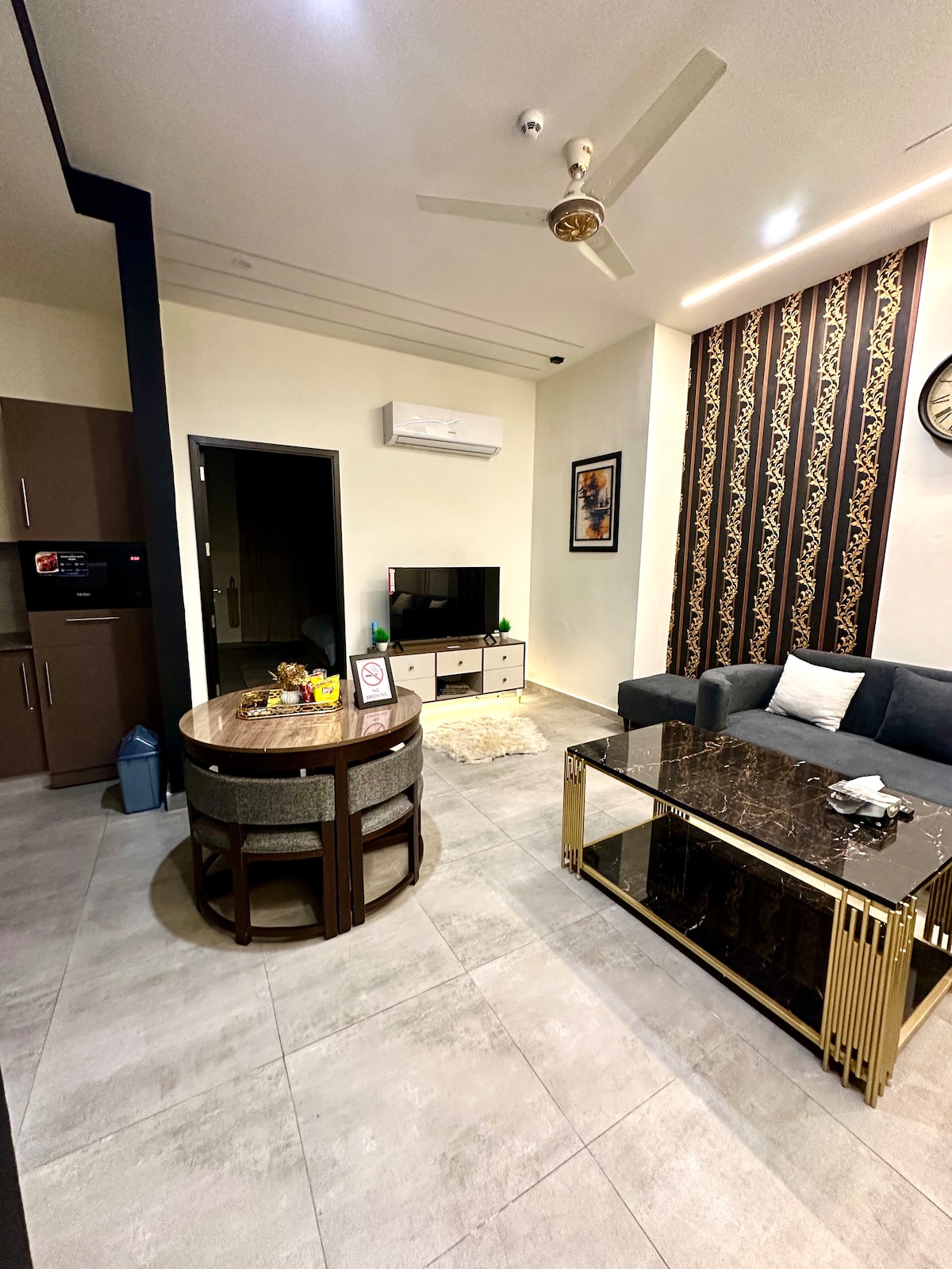 Hangulatos és stílusos 1BHK lakás önálló bejutást biztosító intelligens zárral, 60 hüvelykes tévével és fa témájú dekorációval, tökéletes a kényelmes tartózkodáshoz. Élvezd a nonstop szobahűtést és -fűtést, valamint a meleg vizet. Kényelmes ágyak, plüss kanapék és Netflix a 60 hüvelykes okostévén. Teljesen felszerelt konyha hűtővel, sütővel és harapnivalókkal. Sakk és luddo. Saját erkély, önálló bejutás, saját bejárat, közvetlen lifthez való hozzáférés és ingyenes parkolás. Közel van híres éttermekhez és olyan látnivalókhoz, mint a Faisal mecset, a Monal, az F9 Park és a Lake View.