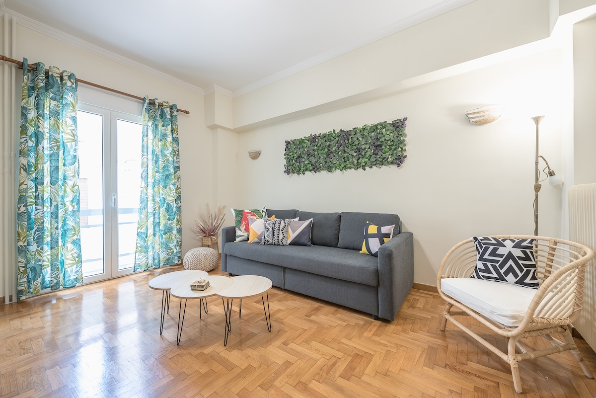 Stay at Belle Étage, a stunning 222 m² corner floor-apartment with wrap-around balconies overlooking the park and the lively Fokionos Negri pedestrian street. This elegant 4-bed/3-bath home features a master ensuite, flexible king/twin bedrooms, a huge 90" TV with Netflix, fast Wi-Fi, a spacious living room with dining for 8, and a large fully equipped separate kitchen. A/C in every room and radiator heating ensure year-round comfort.