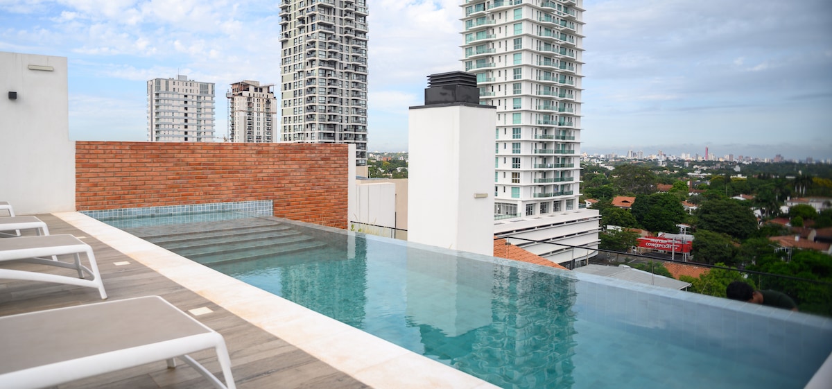 Magas emeleti lakás, erkély és akadálytalan kilátás, teljesen felszerelt a kényelmes tartózkodáshoz: – King méretű ágy kemény, nagy sűrűségű matraccal – Munkaterület íróasztallal és Wi-Fi-kapcsolattal - 55 hüvelykes Smart TV - Tető medencével és edzőteremmel - Quincho - Mosás - 24 órás biztonság Kivételes elhelyezkedés: – A Corporate Axis negyedben található, mindössze 5 percre a Shopping del Soltól és a Paseo La Galeríától – 15 percre a Silvio Pettirossi nemzetközi repülőtértől