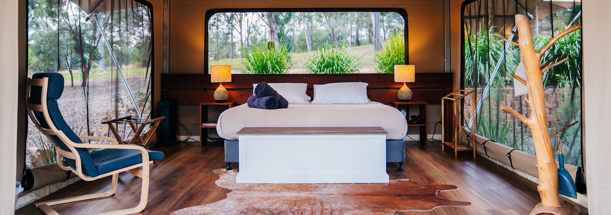 Reconnect with nature at this unforgettable escape. Wallaroo Outback Retreat is found on a 72,000 acre working cattle property hidden in the Carnarvon Ranges, only 1 hour from the iconic Carnarvon Gorge. Designed for self catering, this beautifully appointed glamping tent is one of 10. It offers all your modern creature comforts, while still enjoying a little rustic charm. Enjoy our outback hospitality around the crackling campfire beneath a chandelier of stars.