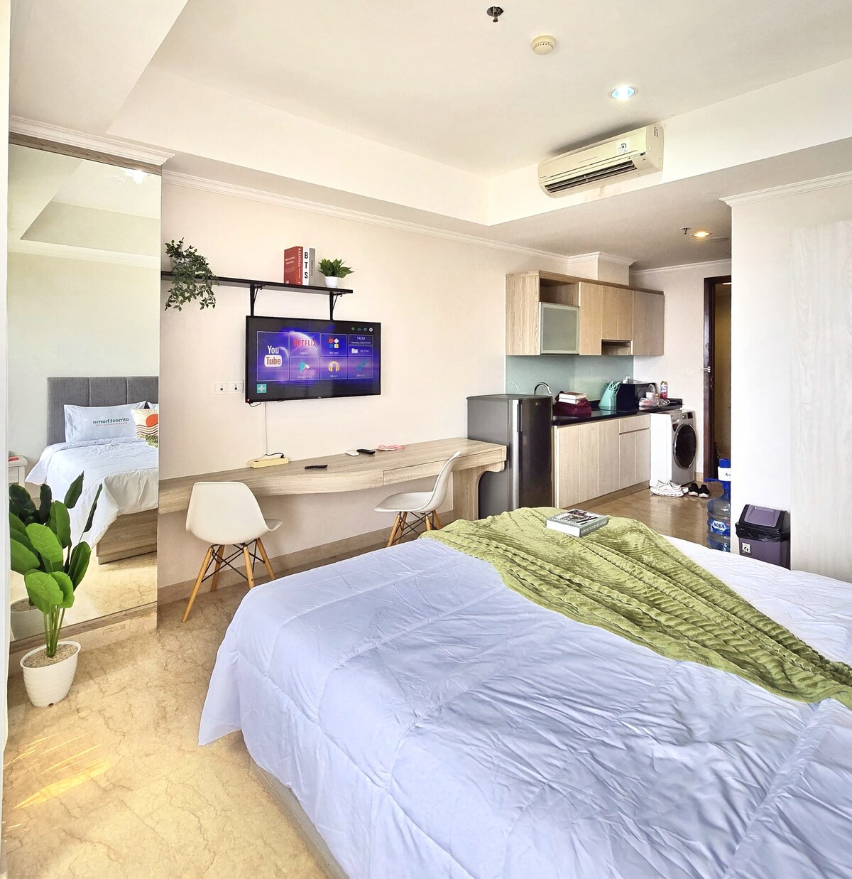 Elegáns, 24 négyzetméteres stúdió Jakartában, ahol a stílus és a kényelem találkozik. Konyha, gyors Wi-Fi, légtisztító, 43 hüvelykes okostévé, hangrendszer és Netflix. Ideális különböző típusú szállásokhoz, érintés nélküli hozzáféréssel és olyan kényelmi szolgáltatásokkal, mint a medence, pezsgőfürdő, edzőterem és kosárlabda. Most fordított ozmózisos vízadagolóval és élelmiszer-hulladékkezelővel rendelkezik, A képen egy gáztűzhely látható, amelyet egy indukciós tűzhely váltott fel (a lakás tűzveszélyre vonatkozó irányelveinek követéséhez)