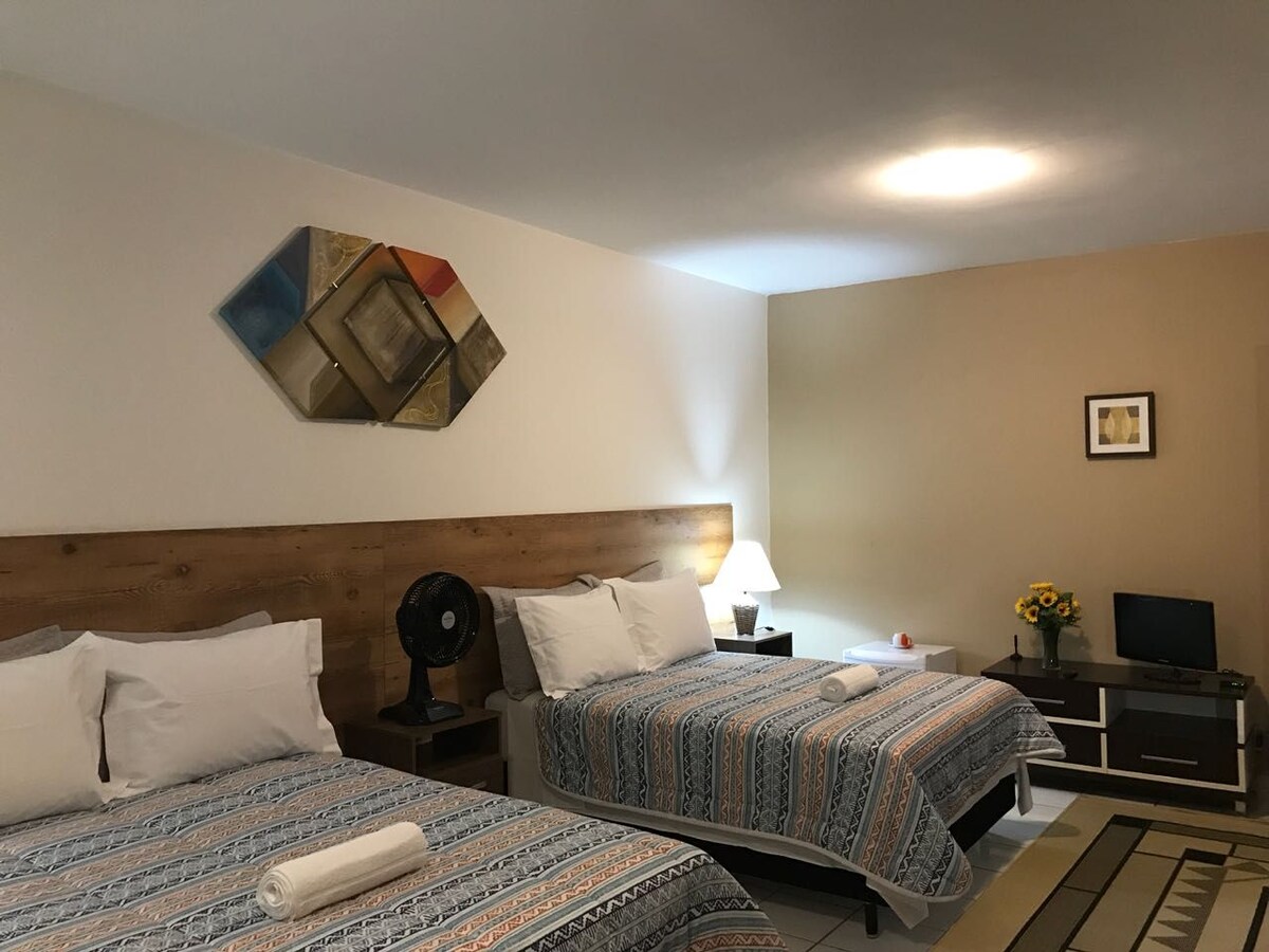 Klasszikus kétágyas szoba. A földszinten található, kilátással a fő kertre és a belső teraszról. Ez az Ametauná szoba, amelyet Chiquitano motívumokkal díszítettek; a legolcsóbb az összes szolgáltatással és kényelmi szolgáltatással. - Légkondicionálás - TV - WiFi - Hűtőszekrény - Higiéniai termékek - Napi takarítás - A villa Chiquitana a pihenés és a kényelem tágas környezete, ahol megtapasztalhatod Chiquitania lényegét.