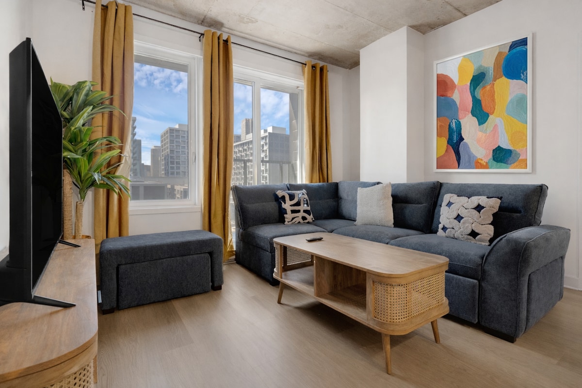 Enjoy a refined stay in this modern Downtown Montreal retreat for up to six guests. The unit offers a queen bedroom, two sofa beds, a full kitchen, and a contemporary bathroom. With bright open-concept living and a prime location near dining, shopping, and major attractions, it’s ideal for families, professionals, and long-term guests.