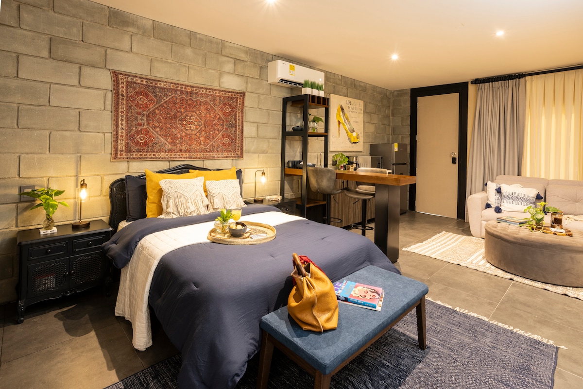 🌴 EXSTR LAKÁS • Granada 204 💃🏾🕺🏽 Ez a gyönyörű rövid távú szálláskiadás kényelmesen, mindössze egy háztömbnyire található Cali legjobb Zona Rosától - Granadától. Úgy terveztük, hogy maximális kényelmet nyújtson a szálláshelyen: lenyűgöző magasságú mennyezet, kényelmes bútorok, gyors WIFI, függönyök és sötétítő függönyök. Ez az egyágyas, egy fürdőszobás stúdió a második emeleten tökéletes választás pároknak, egyedül utazóknak és digitális nomádoknak. Minden csapban van meleg víz, légkondicionáló, okostévé és kiváló minőségű queen méretű ágy.