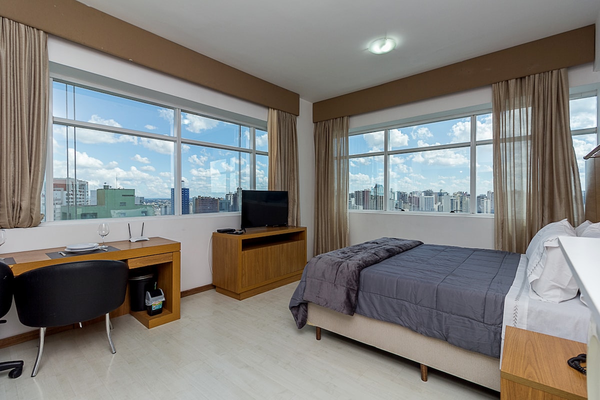 Új és kényelmes stúdió a város szívében. 24 órás recepció, kávé/étterem, coworking, fitneszközpont, mosoda és kerékpárkölcsönzés - mindezt a társasházban. Ideális hely a turizmus és az üzleti élet számára. Könnyen megközelíthető buszpályaudvar és repülőtér, turistabusz, az ikonikus XV Street, bevásárlóközpontok, Guaíra színház, szövetségi egyetem, a Couto Pereira Stadion és a Paulo Leminski Pedreira/Ópera de Arame oldaláról, amelyek üdvözlik a nagy show-kat.