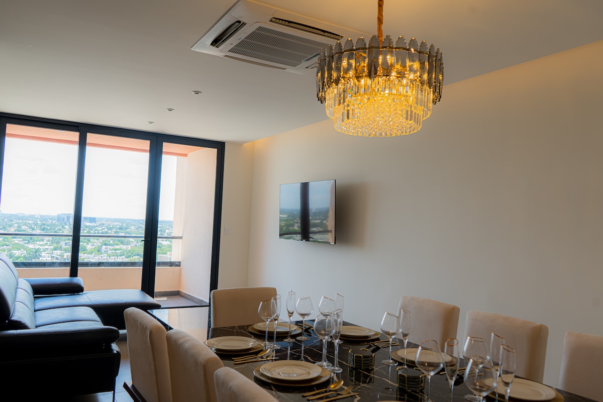 Loft en renta vacacional, ubicado en el piso 17, de Adamat Mérida, acondicionado para disfrutar de su vista desde cualquier ángulo , ya sea el comedor, sala o recámara, al interior del fraccionamiento residencial Cabo Norte donde encontrarás el más importante centro comercial de la ciudad, Plaza La Isla, a escasos 2 minutos caminando, además de lagos senderos para caminar, alberca, gimnasio, yoga room , game room, Sky Lounge, Roof garden y lavandería