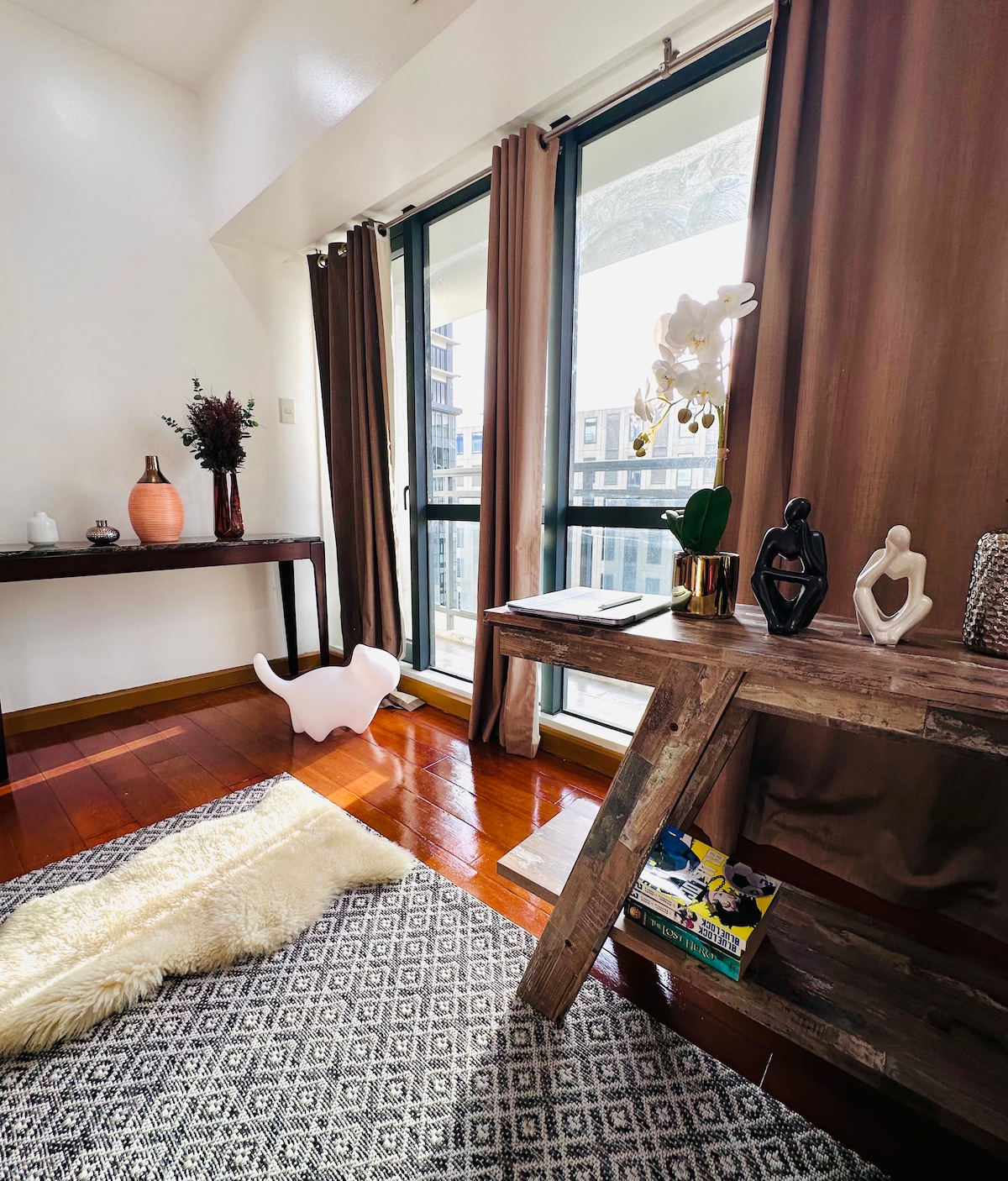 Szállj meg ebben az egyedi és stílusos, századközepi modern LOFTBAN, amelyből CSODÁLATOS ÉS AKADÁLYMENTES NAPLEMENTÉT és VÁROSI KILÁTÁST nyújt a Gramercy Residencesben, egy 5 csillagos társasházban, amely Poblacion központjában található. Élvezd ezt a vadonatúj, központi fekvésű, 1 hálószobás loftlakást lenyűgöző dizájnnal és eredeti műalkotásokkal. Magas emeleten található, 5 csillagos kényelmi szolgáltatásokkal, teljesen felszerelt konyhával, erkéllyel és mindennel, amire szükséged lehet a tökéletes tartózkodáshoz: 300 Mbps-es optikai Wi-Fi, Netflix, 55 hüvelykes okostévé, végtelenített úszómedence, modern edzőterem, szauna és nonstop portaszolgálat stb.