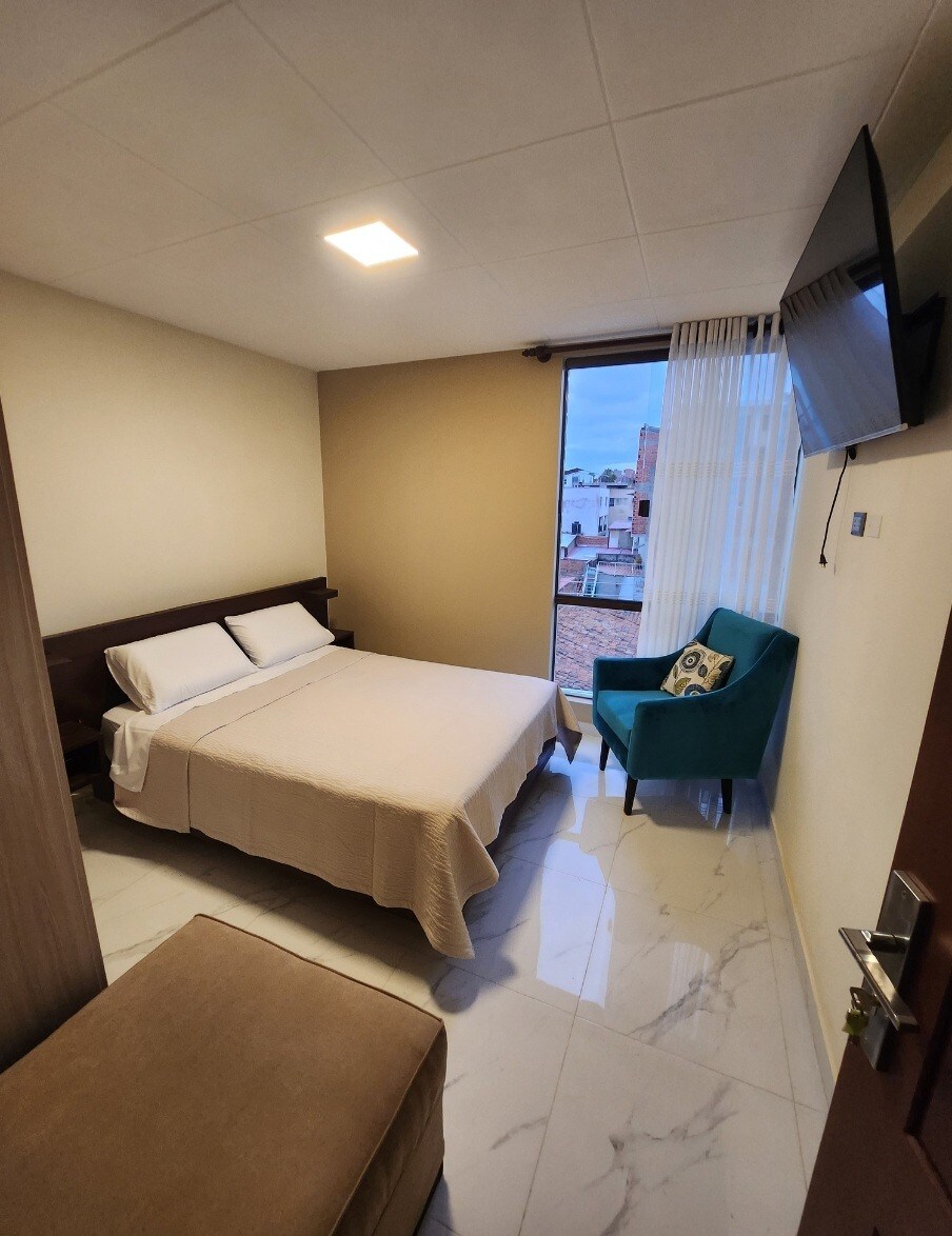 In the heart of Tarija city, on Las Américas Avenue, just a 3‑minute walk from the main square and cathedral, and close to restaurants, cafés, shops, and a 24‑hour pharmacy, this studio apartment is ideal for solo travelers or couples visiting Tarija. It includes: - A double‑size bed (2½‑plazas) - Kitchen sink and electric kettle - Table with chairs and dishware - Smart TV and Wi‑Fi - Private bathroom Shared amenities include a microwave, ironing board, and bottled water.