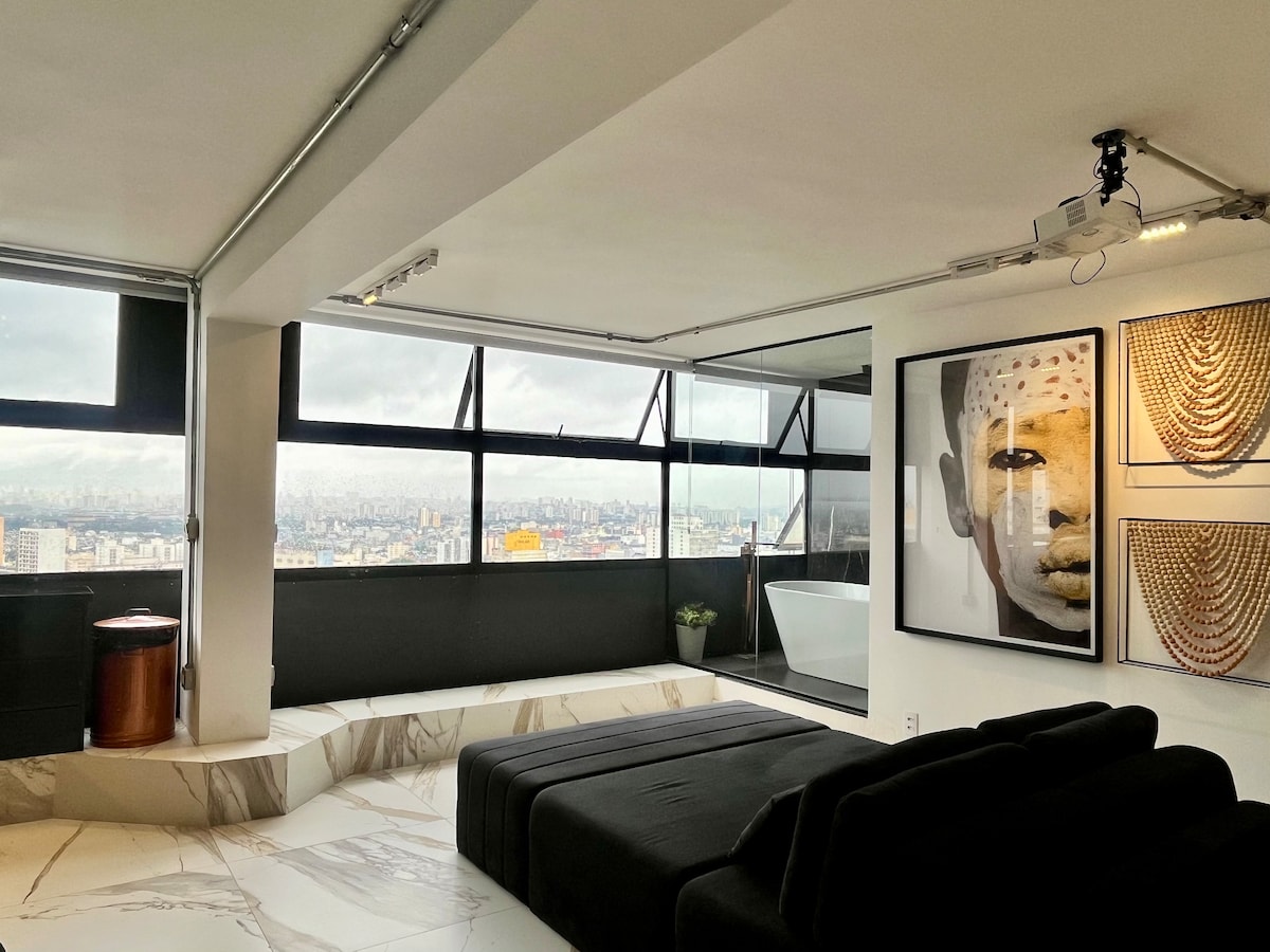 Estúdio espaçoso com muito design, arquitetura e a melhor vista de São Paulo. Loft completo! Com cama queen, closet, ar condicionado silencioso, cozinha completa, home office, WI-FI, TV 55” e uma belíssima banheira de imersão, de onde pode apreciar o seu drink preferido e curtir uma vista apaixonante. São Paulo toda estará há poucos minutos de você. Acesse o metrô andando apenas 200m. Reserve com tranquilidade! Proporcionaremos uma excelente hospedagem e uma ótima experiência!