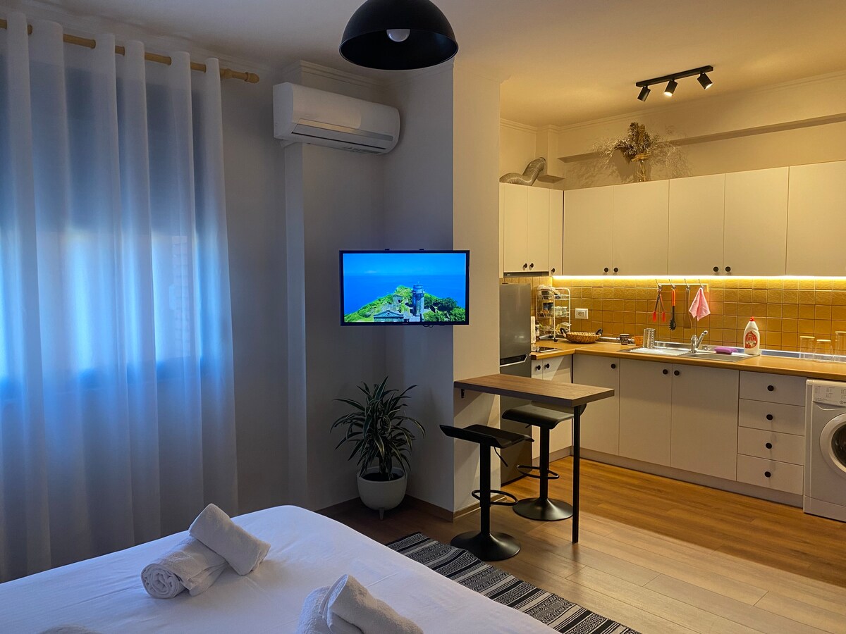 Ez a hangulatos stúdióapartman a tiranai Myslym Shyriben található, kiváló helyen, a Skënderbej tér és a Blloku közelében. A helyiségben egy multifunkcionális szoba található kényelmes ággyal, egy kis étkezővel és egy alapvető készülékekkel felszerelt teakonyhával. A modern fürdőszobában zuhanyzó és vécé található. A lakás a kényelem tökéletes keverékét nyújtja, amely ideális a város kulturális látványosságainak és élénk éjszakai életének felfedezéséhez.